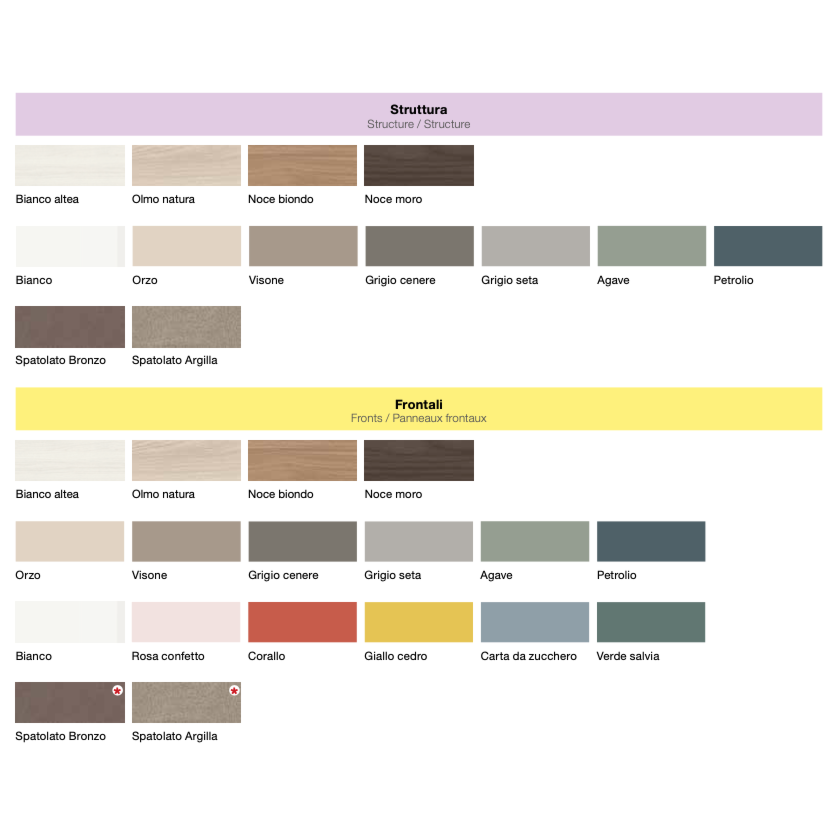 Le finiture proposte sono spatolato Argilla, spatolato Bronzo e Bianco altea. Grazie ad un'ampia gamma di finiture è possibile personalizzare la cameretta per adattarla ai propri gusti!