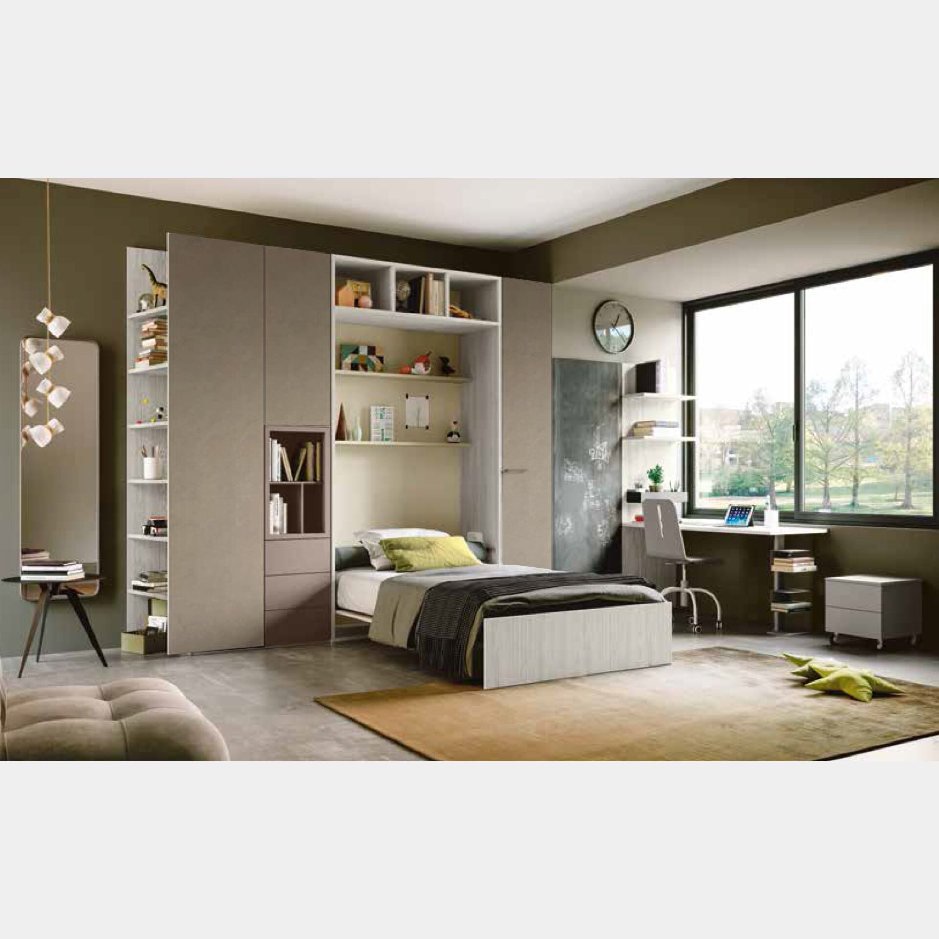 Achille: letto composizione armadio e letto a scomparsa in bronzo, argilla e bianco