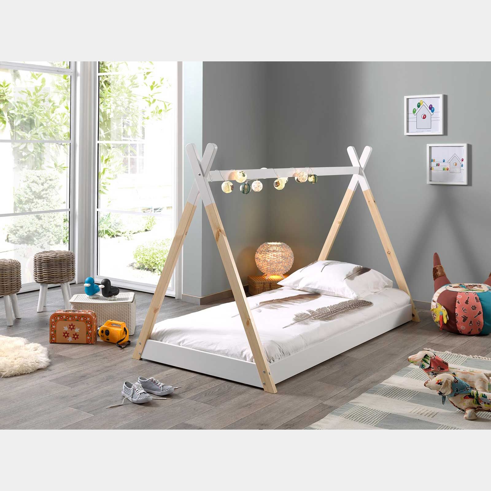 Il letto montessoriano, realizzato in pino massello, è laccato bianco e naturale. I bambini adorano il design giocoso. Questo letto offre tantissime possibilità di decorarlo con ghirlande di luci o altri accessori colorati per creare il letto dei sogni del tuo bambino! Il letto è disponibile anche per bambini piccoli, nelle dimensioni di 70x140 cm.