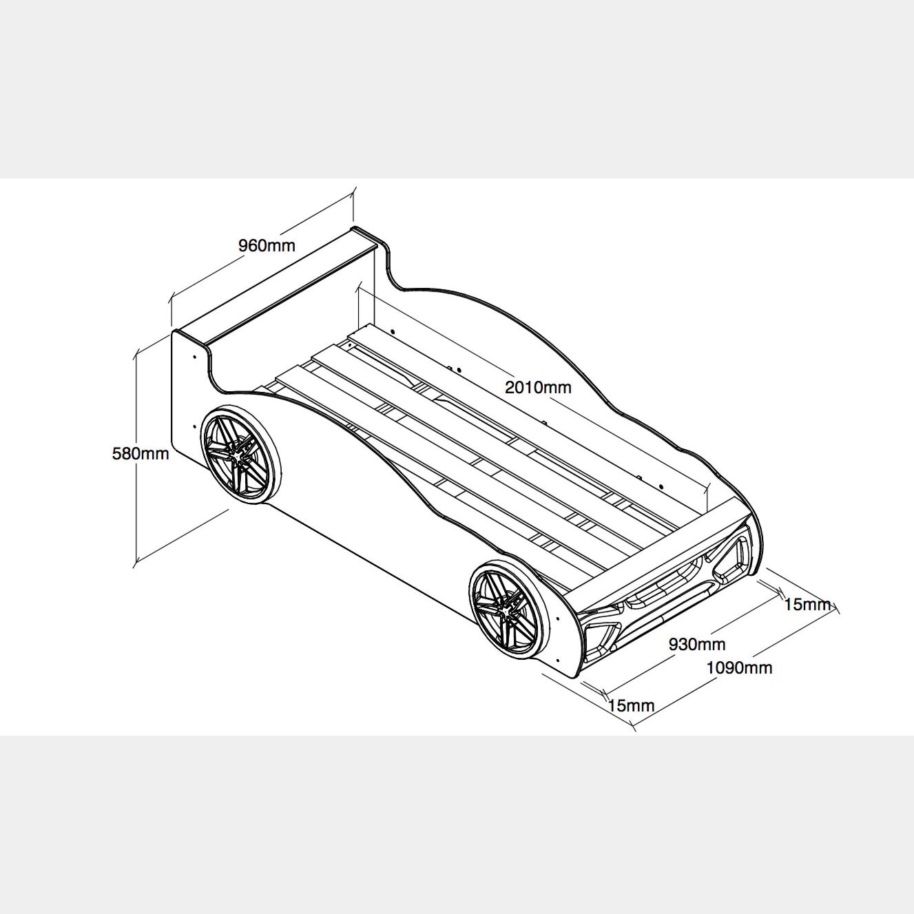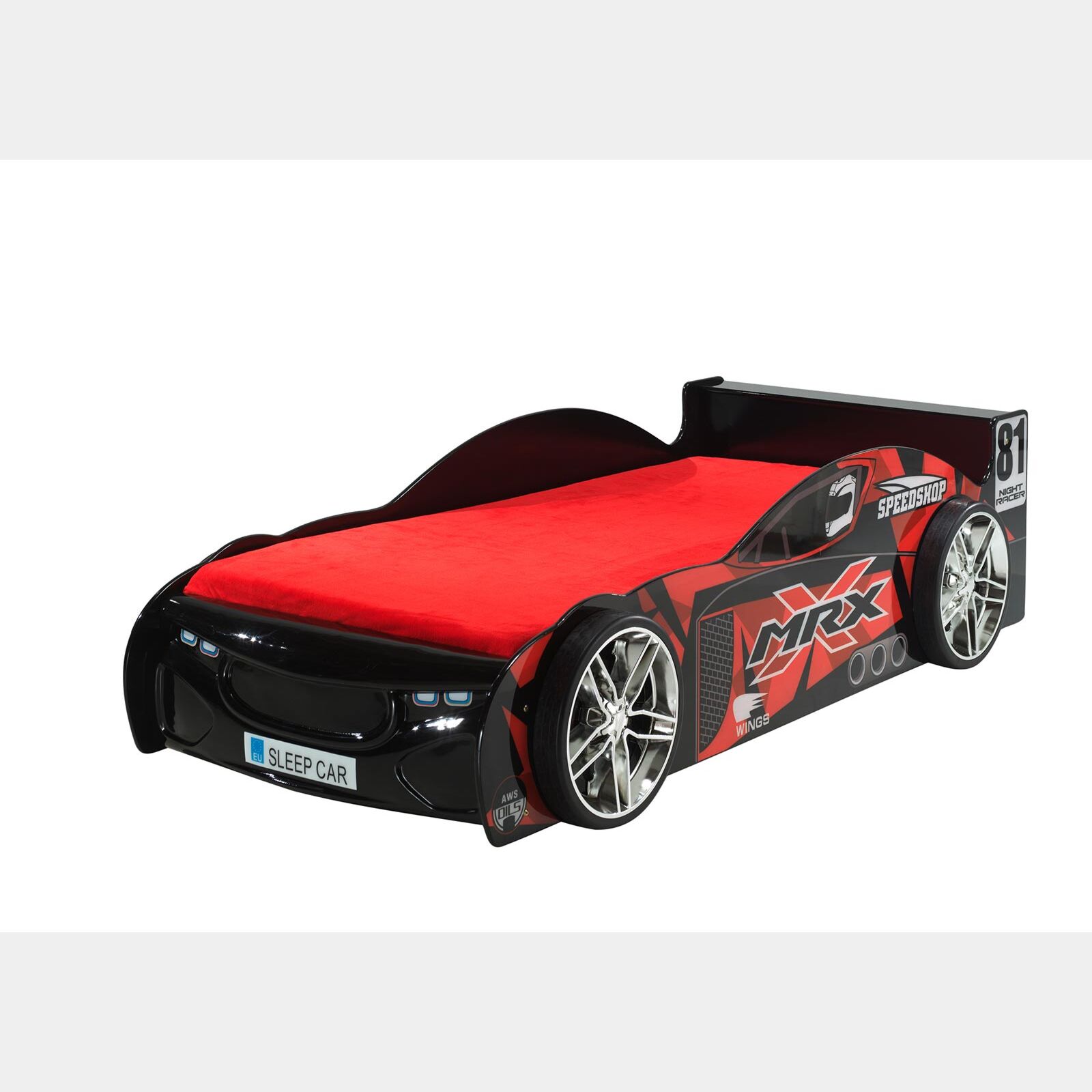 Letto auto MRX con superficie di appoggio 90 x 200 cm. Il letto è prodotto con pannelli in perticelle di legno laccati nero lucido con grandi applicazioni colorate. I lati del letto sono curvi, tutti i bordi sono arrotondati. Le ruote larghe e svasate (fisse), con al centro un'imitazione del bordo in alluminio lucido, sono un grande dettaglio di questo letto. Il letto è stabile e di alta qualità. La rete a doghe è inclusa.