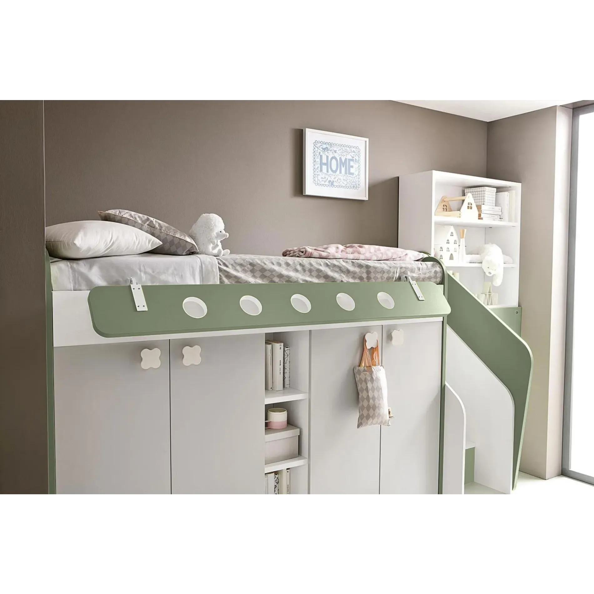 Il letto a castello è pensato per camerette con dimensioni ridotte. In un'unica struttura, oltre al letto, è possibile trovare 2 armadi e una libreria. La finitura è in Nebbia e Salvia, grazie ad un'ampia gamma di colori però puoi giocare accostando diverse tonalità per creare il tuo contrasto ideale!