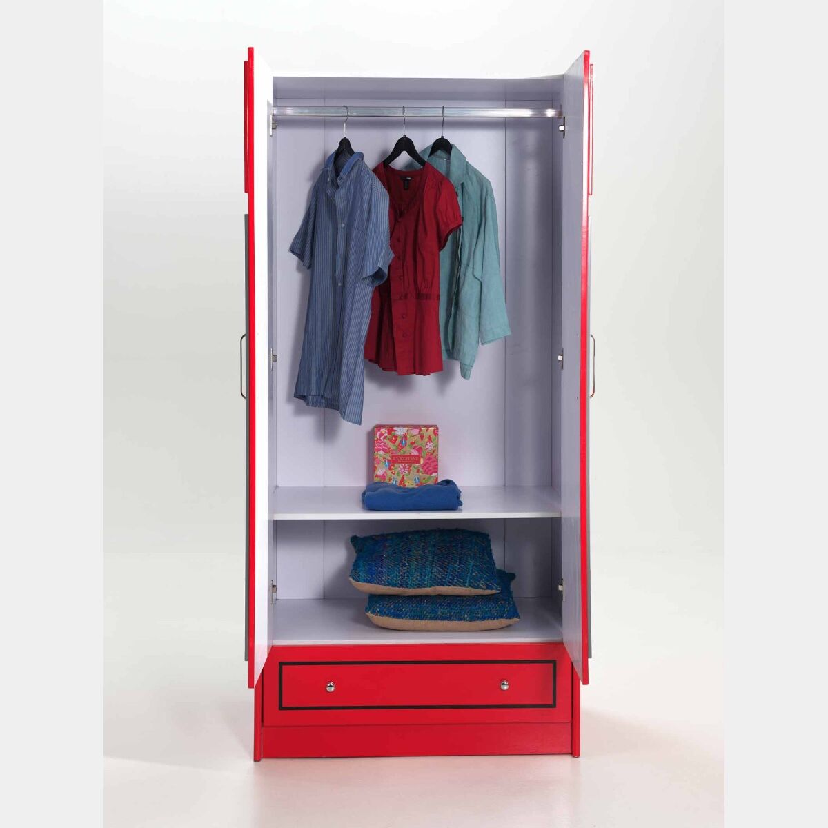 Armadio: è possibile richiedere tramite configuratore l'armadio a due ante con cassetto inferiore, che riprende le colorazione e il design del letto a castello. L'allestimento prevede un ripiano ed un tubo appendiabiti, le ante sono dotate di soft-close. Dimensioni: L.88 H.190 P.56 cm