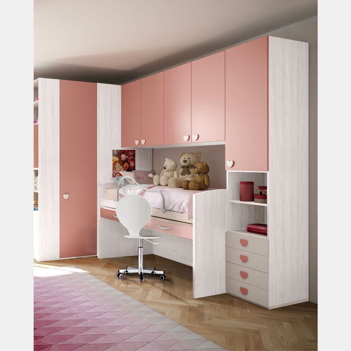Nello spazio vuoto sottostante è possibile aggiungere come optional un secondo letto con una struttura con 4 cassetti: Secondo letto ad estrazione con cassettoni I frontali dei cassetti sono in finitura rosa antigraffio, mentre le struttura del letto è in finitura Ciliegio.