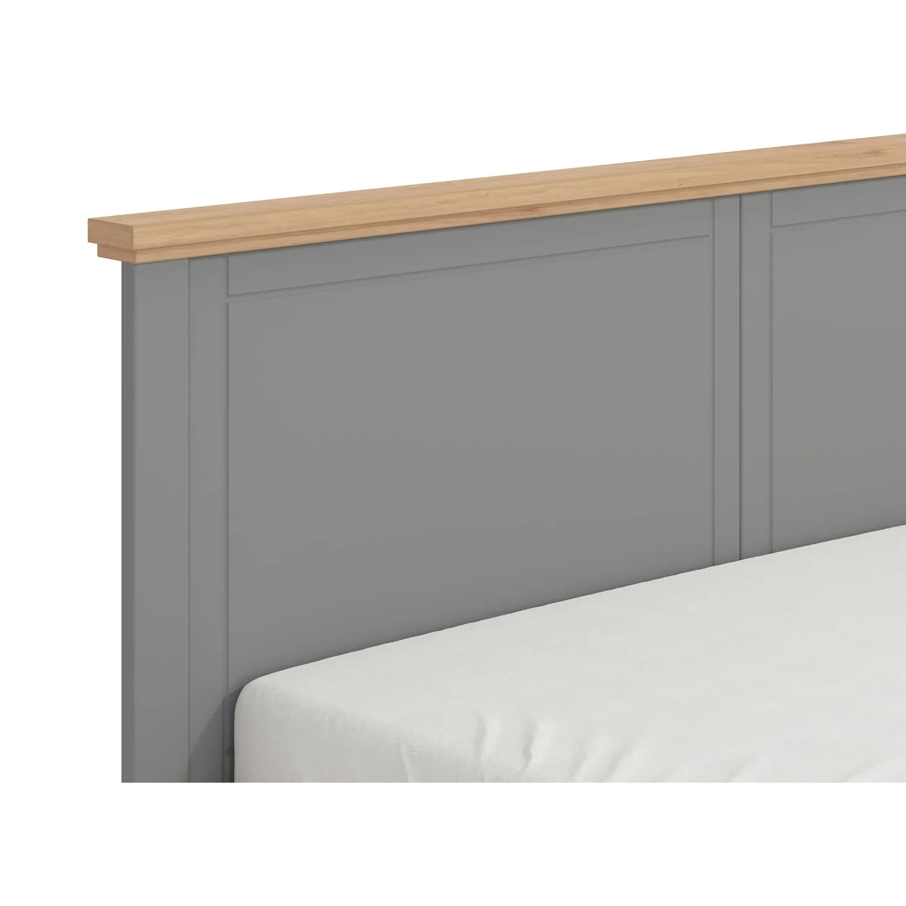 La struttura è in Grigio grafite, mente il top della testata è in Rovere, l'accostamento delle due tinte genera armonia e calore, rendendo la camera da letto accogliente e ricercata.