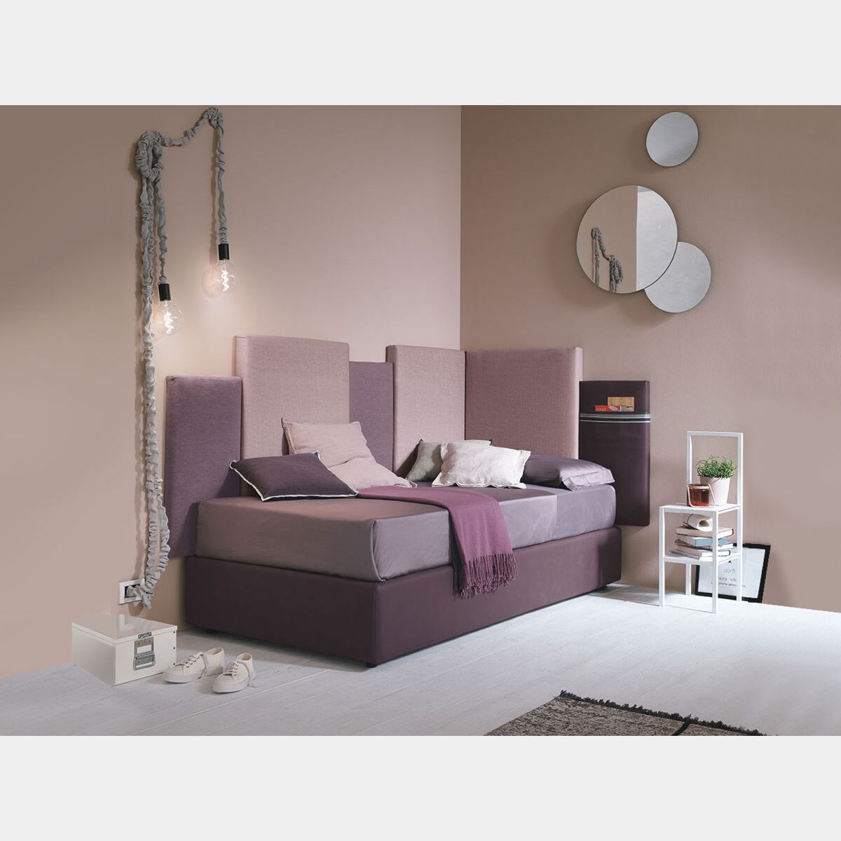 Nuove geometrie caratterizzando il letto singolo offrendo uno stile moderno e tutto nuovo, capace di personalizzare con carattere la cameretta di tutti i bambini. L'alternanza di pannelli posti ad altezza differenti crea movimento e stile all'ambiente, le due finiture in lilla si contrappongono per enfatizzare ogni singolo pannello, assicurando così un effetto unico e ricercato.