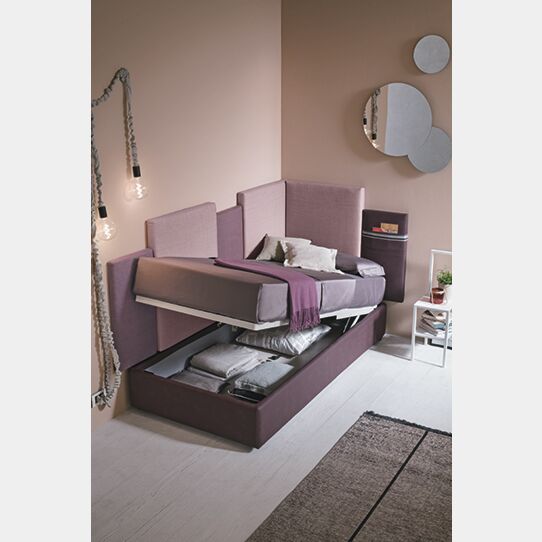 Il letto contenitore presenta rete a doghe con meccanismo di sollevamento incluso, ideale per ambienti dalle dimensioni ristrette che necessitano ultriore piano di appoggio per cuscini, coperte o giochi. Il giroletto in ecopelle è interamente sfoderabile e rivestito sui quattro lati.