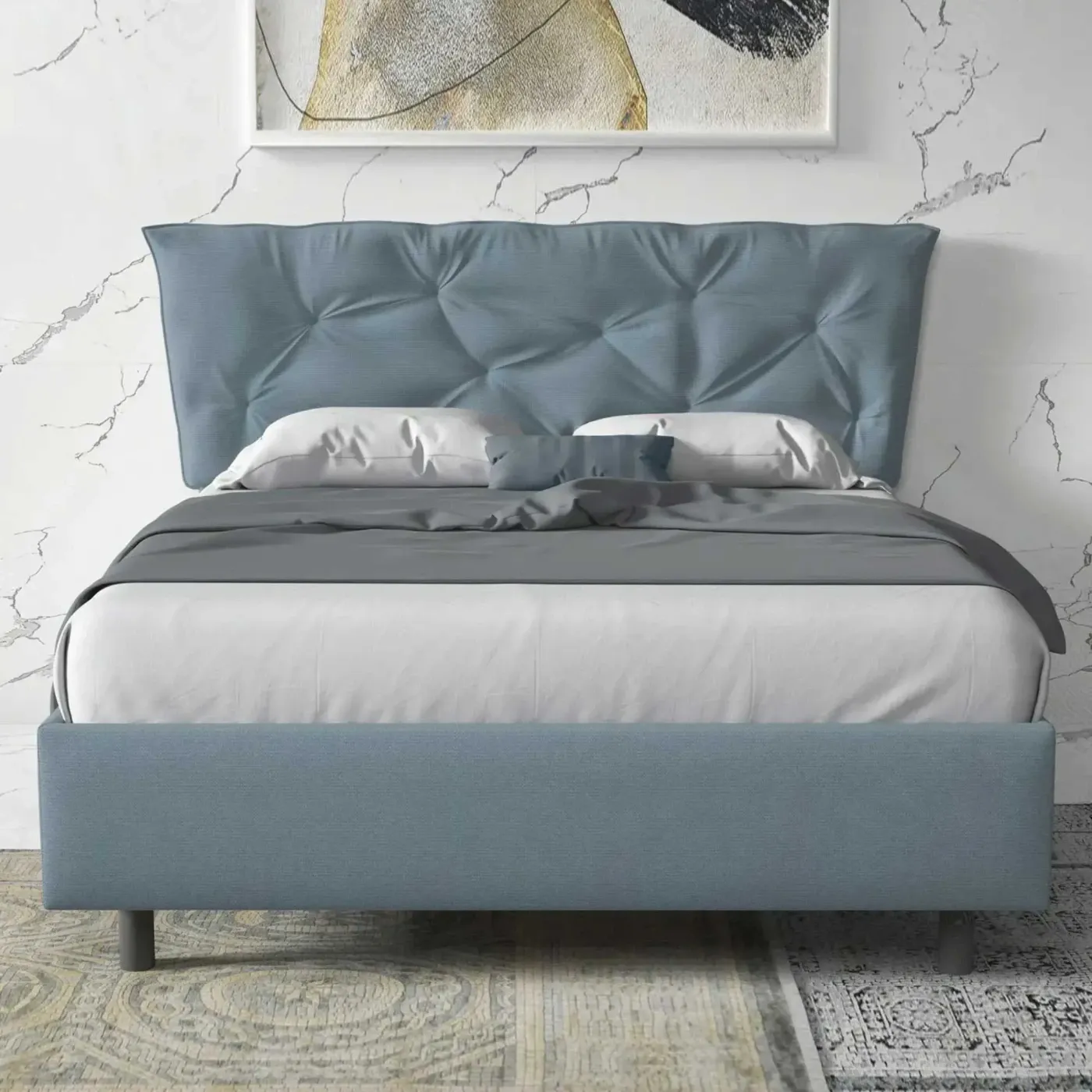 Letto matrimoniale in tessuto colore Azzurro con rete contenitore. E' disponibile anche in versione Ghiaccio.