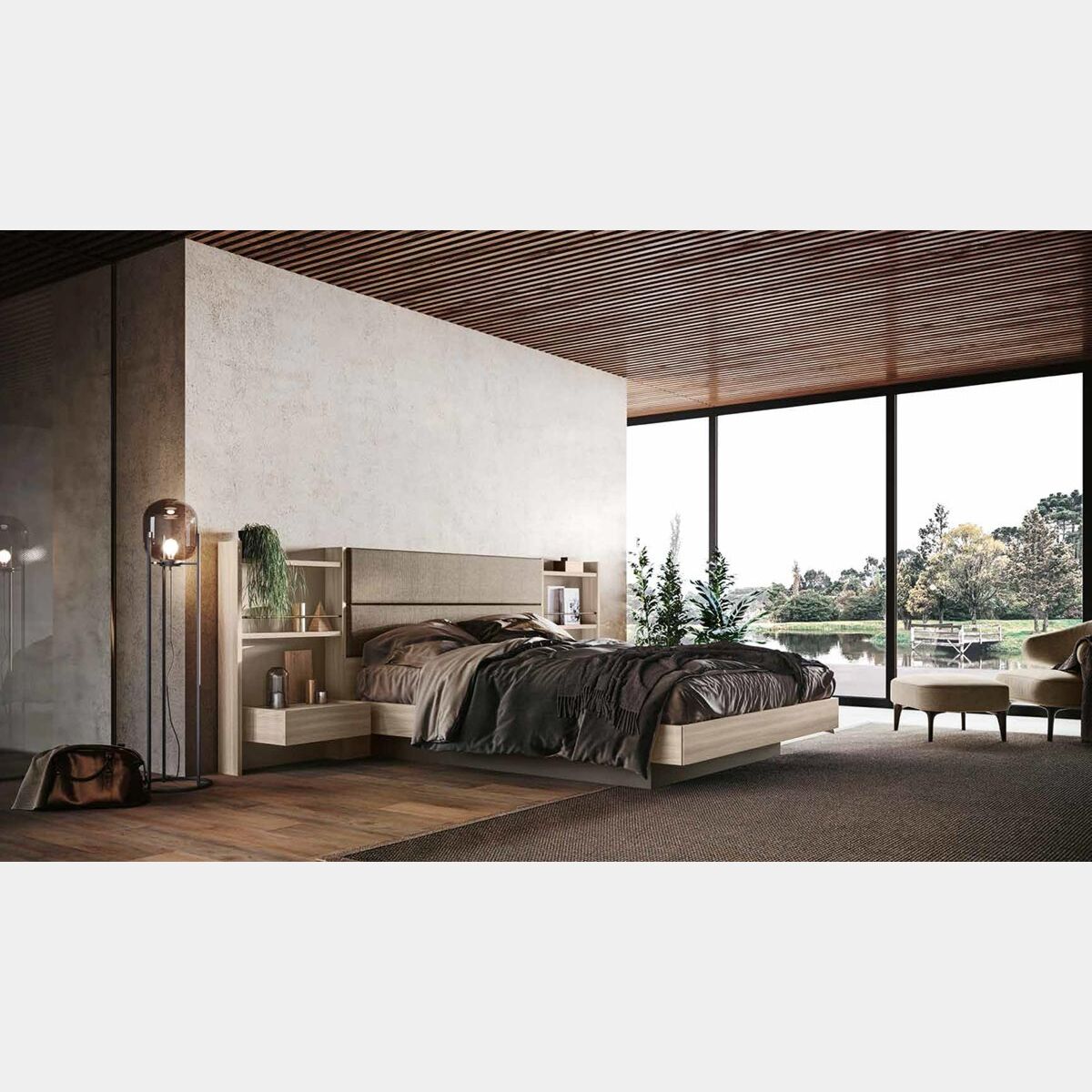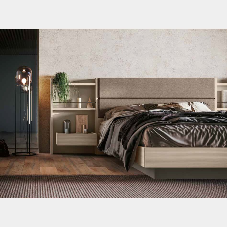 Una caratteristica che salta subito all'occhio sono i particolari timpani posti a lato della testata: elementi di design con due ripiani proposti in Olmo natura e Visone; per completare la struttura è possibile richiedere il comodino sospeso.
