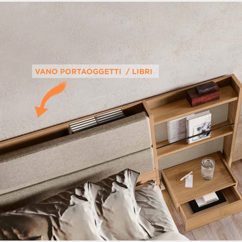 Ultimo elemento, ma non meno importante, è l'inserto in tessuto in testata: di grande impatto il tessuto Castoro crea un piacevole contrasto con la struttura in Noce biondo e accompagna l'Orzo degli schienali per accogliere e sorprenderti ogni giorno.