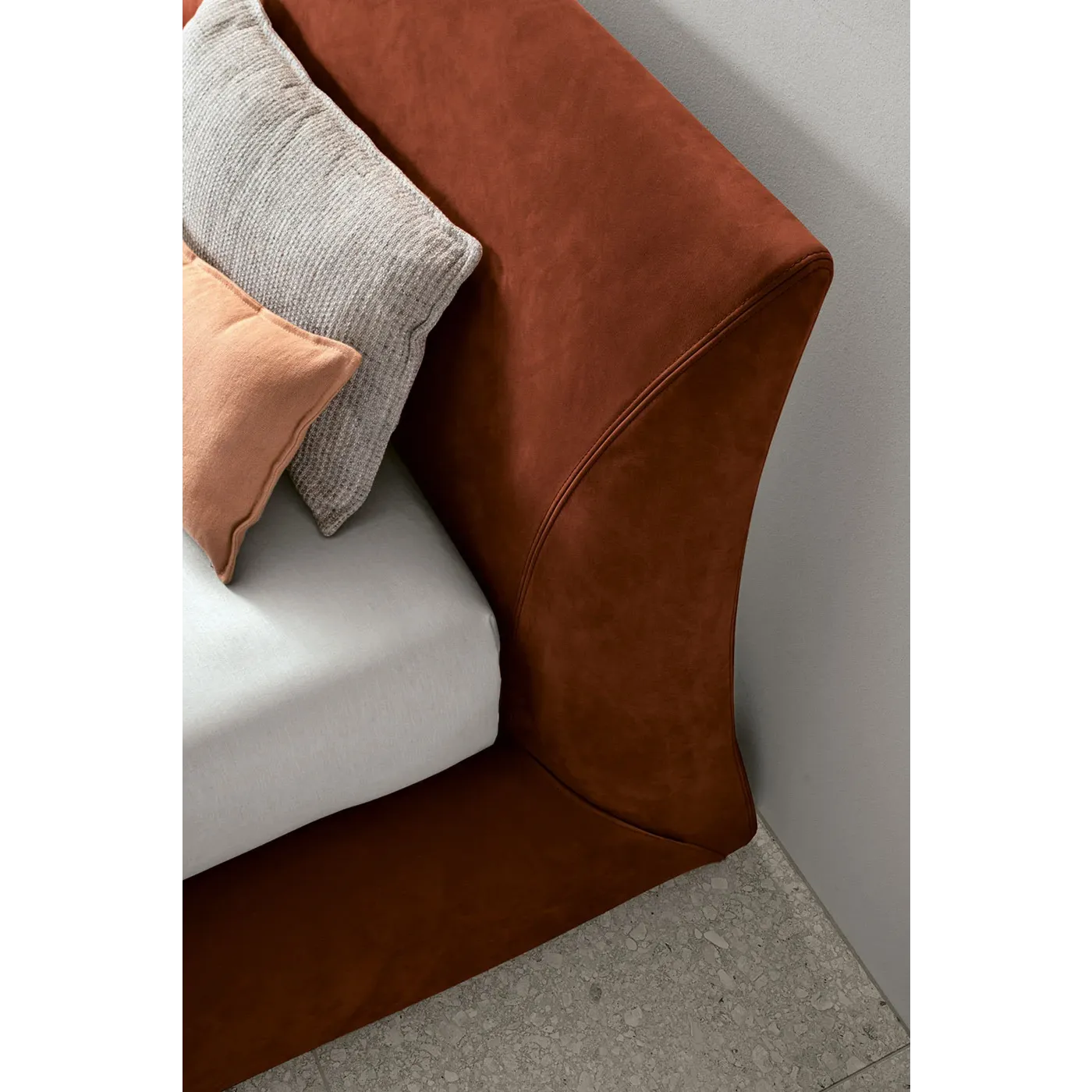 L'elegante tessuto rosso assicura alla camera uno stile elegante di impatto, creando un ambiente caldo e comfortevole. A disposizione vi sono numerose altre finiture per poter adattare il letto Eros alla propria zona notte.