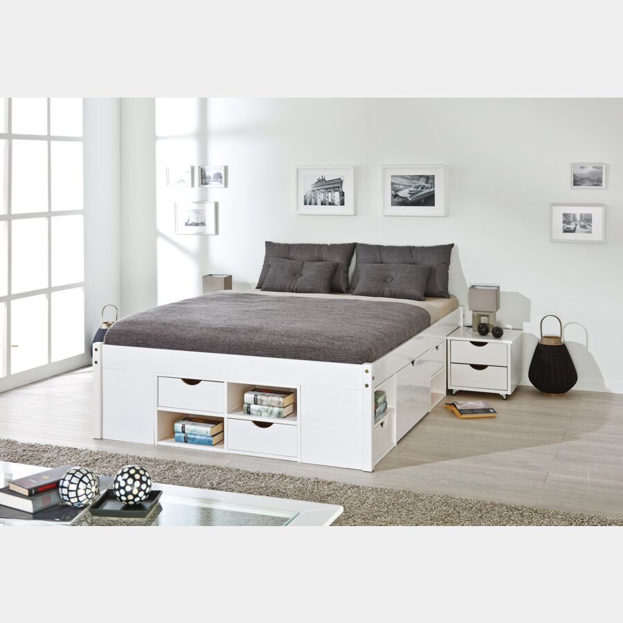 Letto in pino massello colore bianco con vani contenitore e comodino con ruote incluso