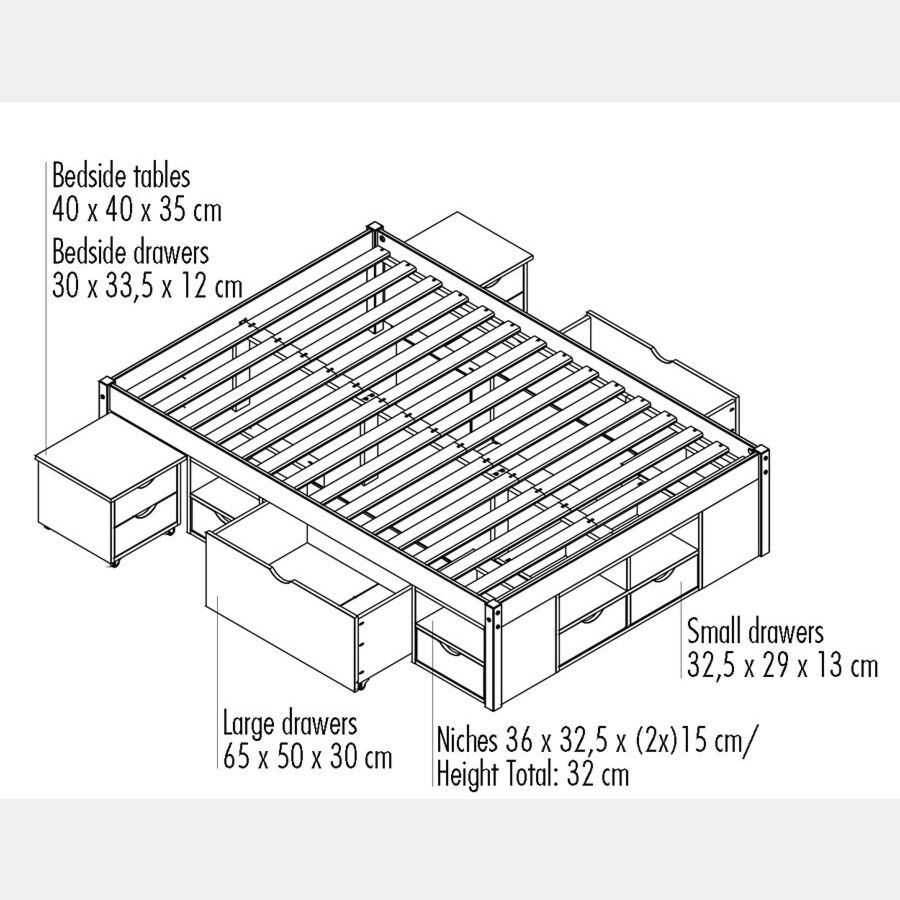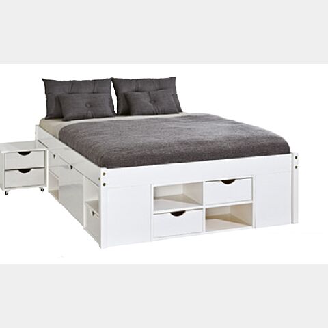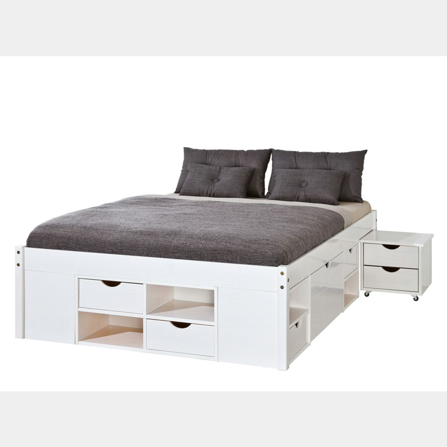 Letto in pino massiccio, verniciato bianco, in legno, idrorepellente e di facile manutenzione, 2 comodini estraibili su ruote con cassetti, 8 vani a giorno, 4 cassetti piccoli.