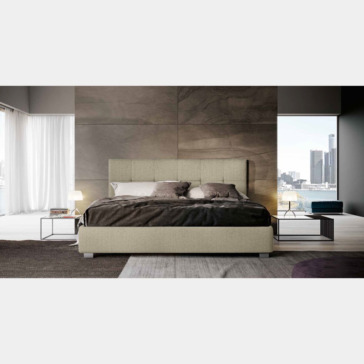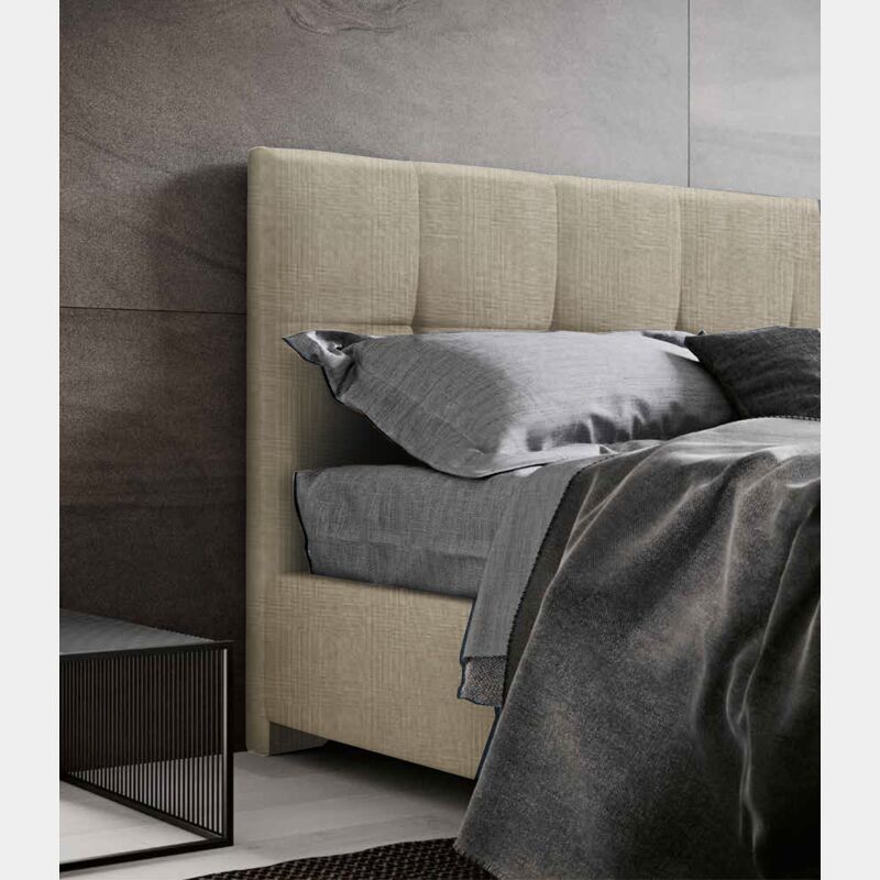 Tradizione e innovazione sono gli elementi chiave che caratterizzano il letto imbottito matrimoniale. Le cucitura della testata formano eleganti quadrati che donano uno stile elegante e ricercato. Anche il tessuto Ermes Beige gioca un ruolo importante: la calda finitura infatti consente un arredo minimal ma di grande impatto, al contempo la lavorazione ne valorizza l'estetica. Grazie ad un ampio campionario è possibile personalizzare il letto matrimoniale, adattandolo ai propri gusti. La testata retrofinita consente al letto di essere posto al centro stanza per diventare protagonista indiscusso dell'ambiente.