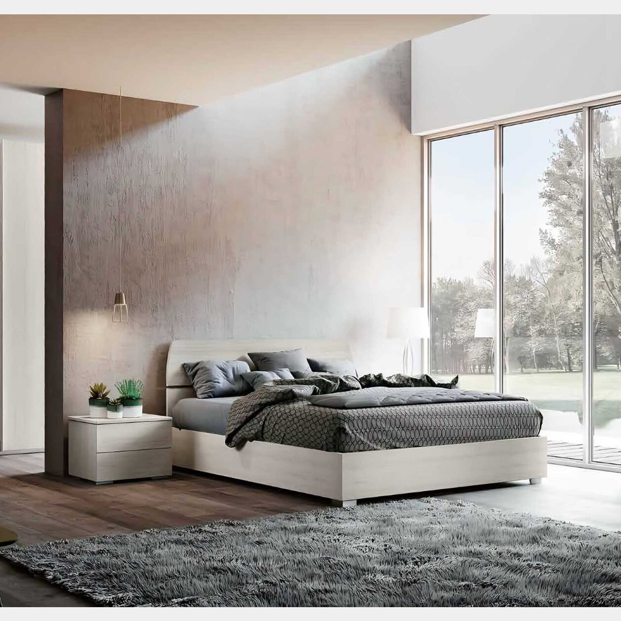 Il letto presenta una testata stondata, composta da due pannelli, ed un alto giroletto in tinta. E' possibile richiedere la rete a doghe fissa da 160x190 o la versione con contenitore, ideale per posizionare la biancheria da letto, cuscini o coperte.
