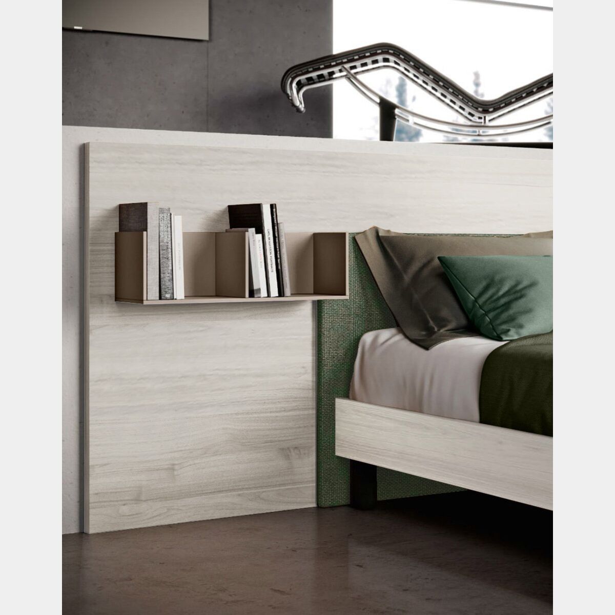 Eleganti finiture si accostano per dare vita ad un letto matrimoniale caratteristico ed elegante, capace di adattarsi a tutti gli ambienti moderni offrendo una soluzione d'arredo ricercata e di forte impatto. Progettato per assicurare l'effetto "wow" il letto presenta una testata composta da due pannelli sovrapposti: il primo è in Bianco altea, finitura ripresa anche nel sottile giroletto dagli angoli squadrati, il secondo è rifinito con un'intensa tonalità in tessuto verde che esalta l'estetica del letto facendolo emergere nella camera da letto.