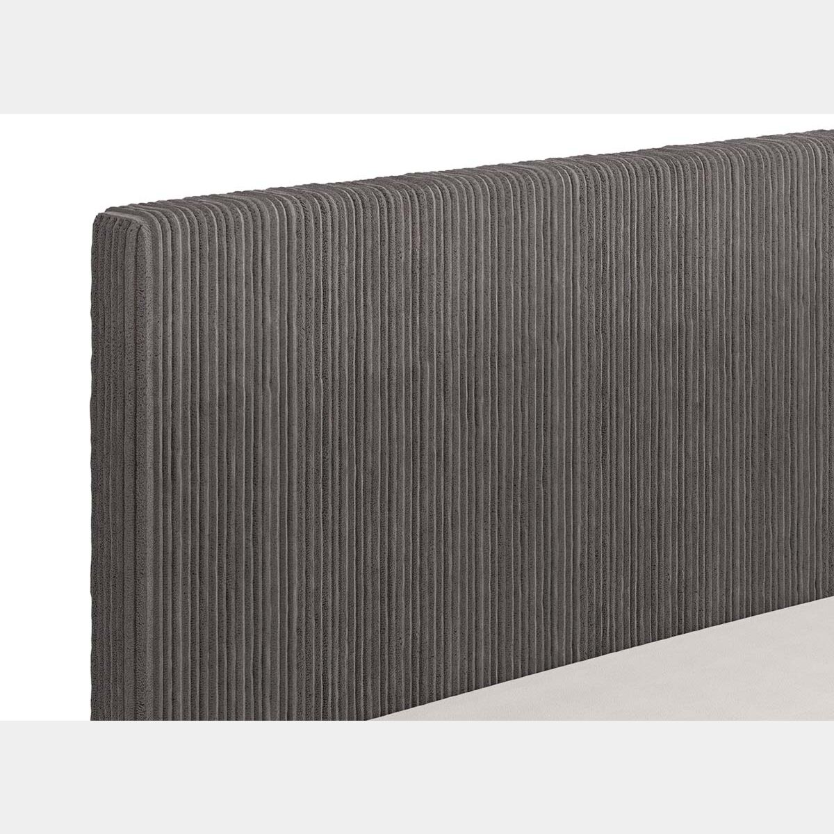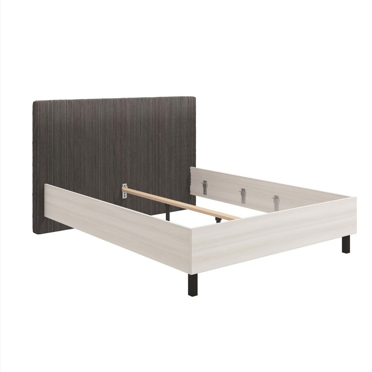 La testata rivestita in tessuto grigio viene completata da un giroletto in legno in finitura Bianco frassino, calda tonalità che dona calore e rende l'ambiente accogliente.