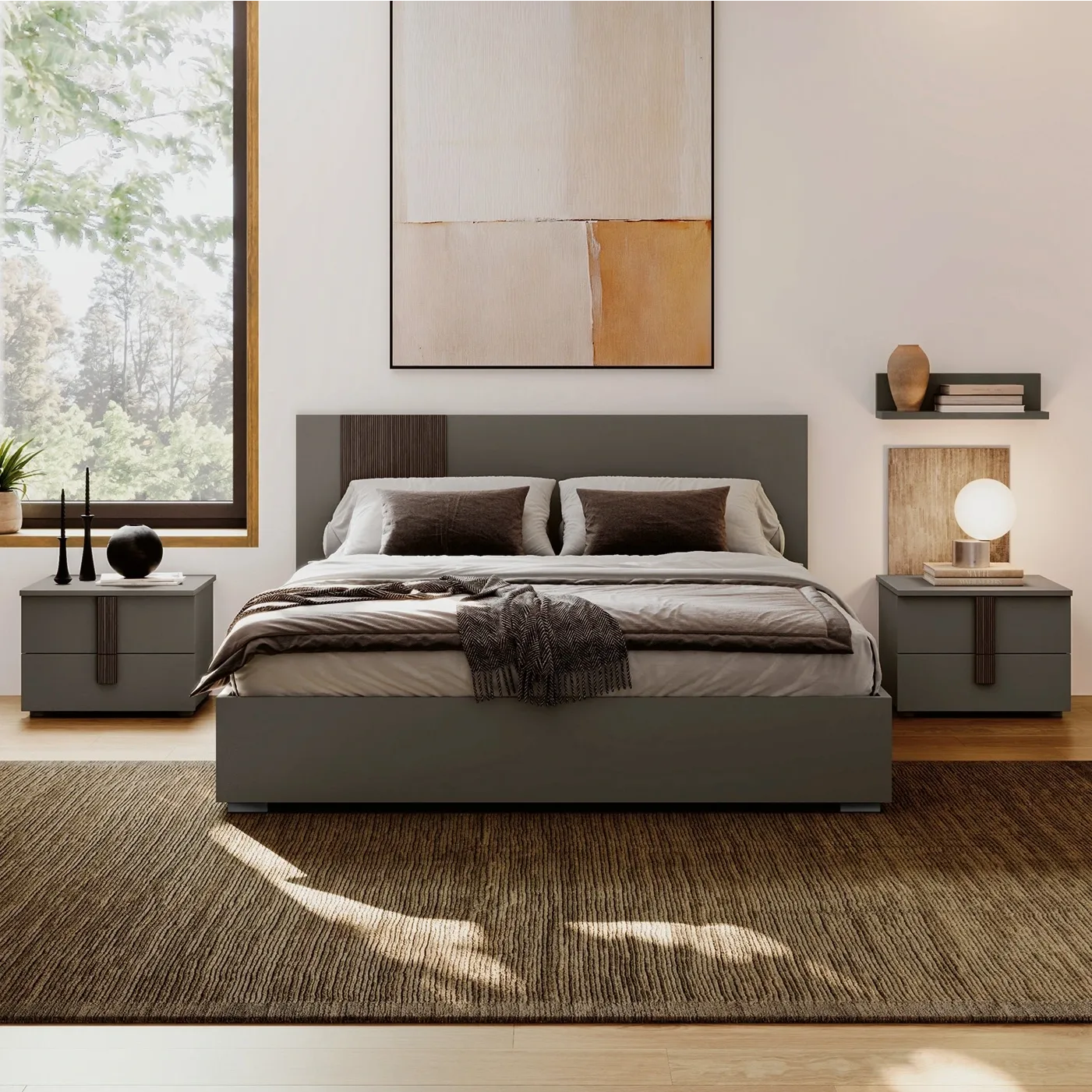 La testiera è il suo punto forte! È ampia e accogliente, nello stesso elegante grigio scuro, ma con un tocco davvero originale: sul lato sinistro, è impreziosita da un pannello verticale cannettato, che rompe la linearità e aggiunge un elemento di texture e design, donando un senso di movimento e unicità.