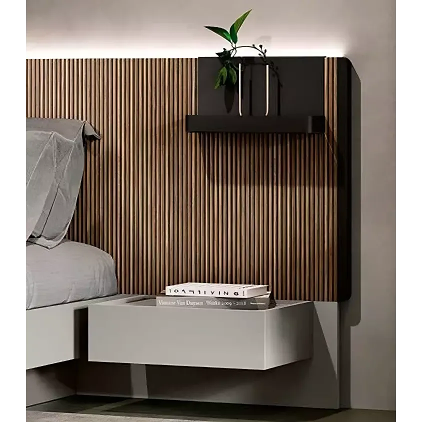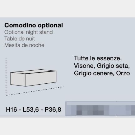 • Finiture: per testata sono disponibili finiture essenza (con venature orizzontali) o cannettato (con finiture verticali). Per giroletto e comodini sono disponibili finiture nobilitate colorate ed essenze, visionabili a campionario.
