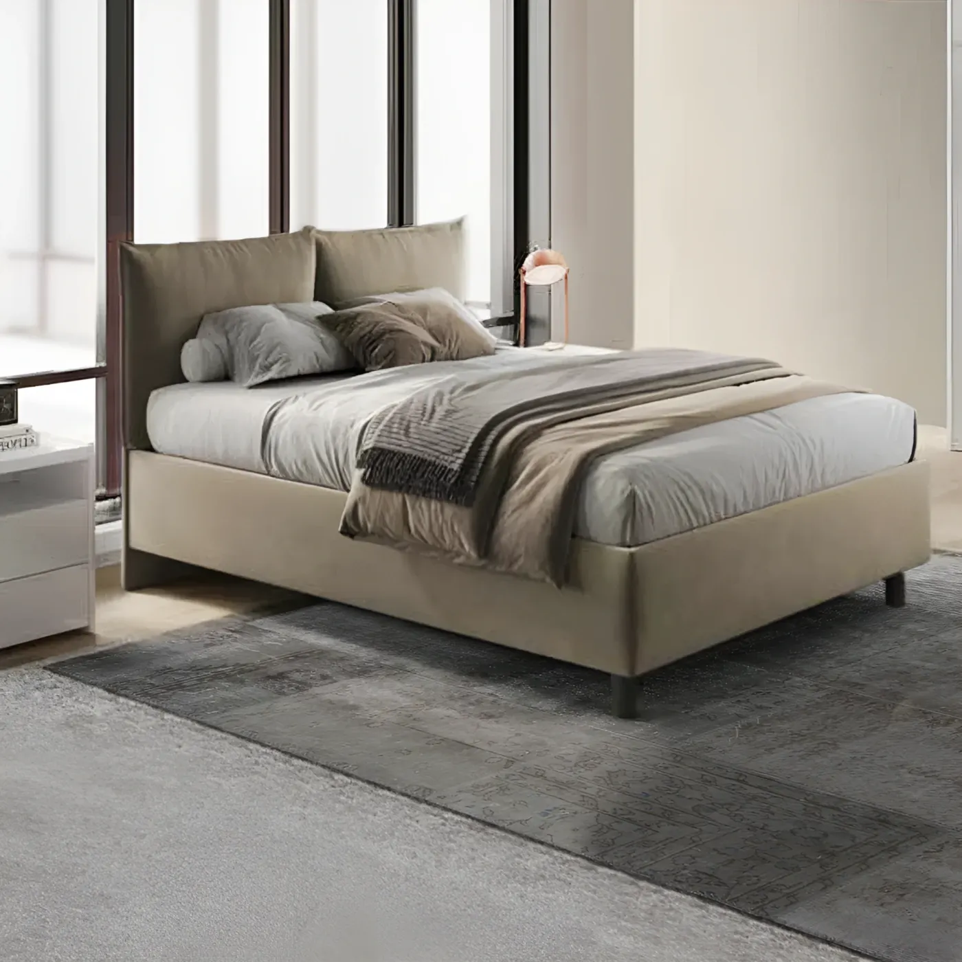 Letto matrimoniale in tessuto colore Sabbia E’ disponibile anche in versione Grigio grafite, Grigio perla, Sabbia,Pistacchio, Marrone scuro, Blu e Rosa antico.
