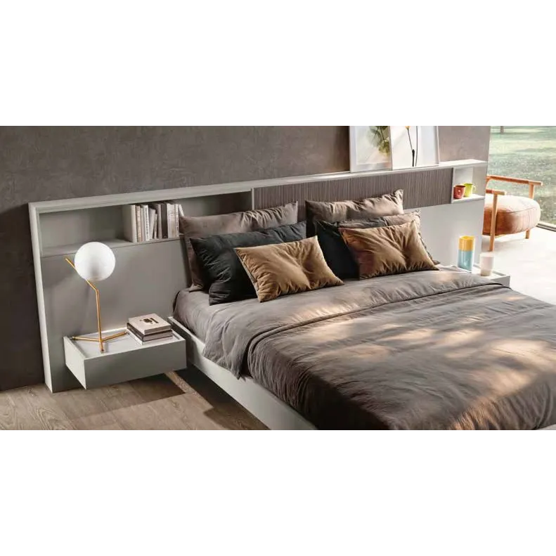 Letto matrimoniale con libreria in testata, Grigio seta e Cannettato grigio