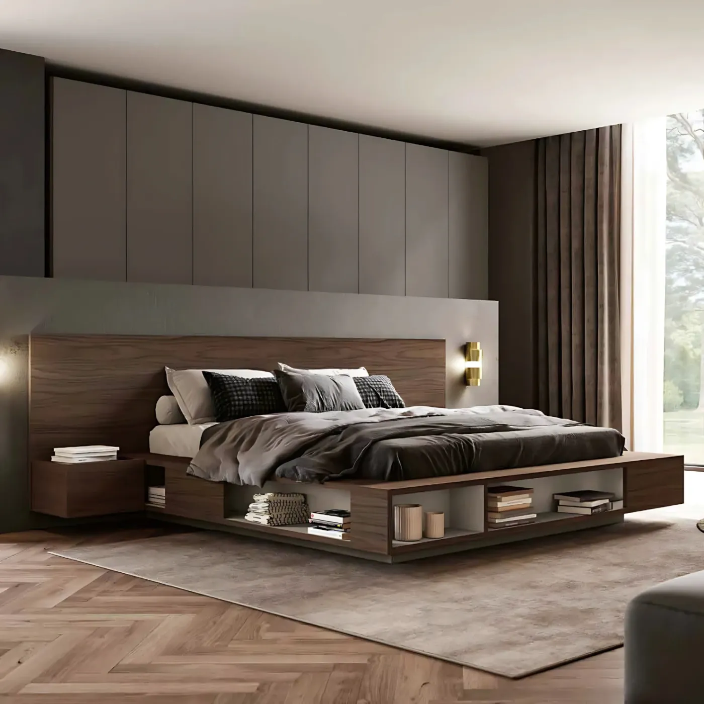 Letto matrimoniale con librerie integrate, , 160x190, Noce moro e Argilla
