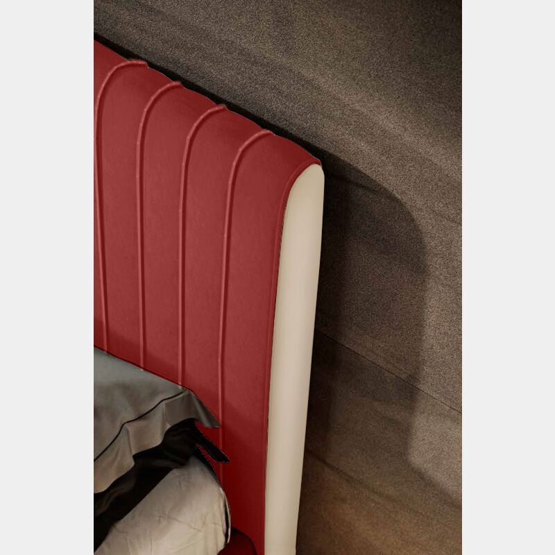 Forme accuratamente studiate, tessuti e colori dal gusto moderno dettano un design ricercato, diffondendo un clima romantico e accogliente. La lavorazione della testata attraverso cuciture verticali enfatizza la linea pulita del letto accentuando l'armonia delle forme. Il letto in ecopelle rossa può essere personalizzato tramite un ampio campionario, anche il timpano orzo può essere sostituito con altre tinte colorate; creare una composizione originiale significa arredare la zona notte con un tocco unico e raffinato. E' possibile inserire la rete a doghe fissa o la versione con contenitore, tramite il configuratore.
