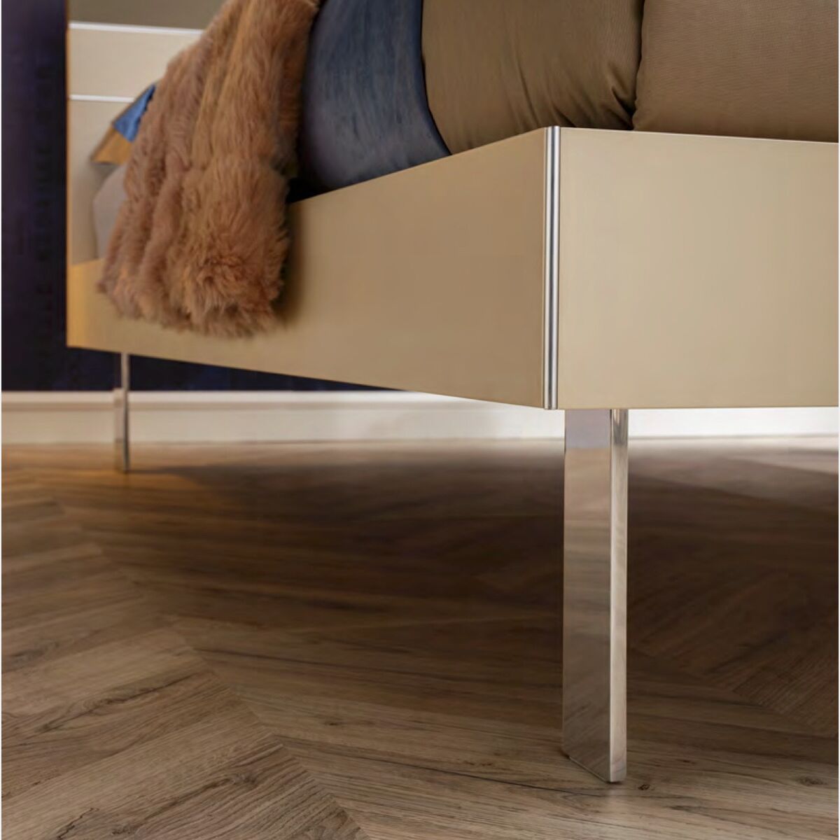 Il giroletto è reso prezioso dal profilo in alluminio effetto cromo che disegna lo spigolo del letto. Della stessa finitura cromata sono anche i piedini, semplici ed eleganti. Il segreto è nel particolare.