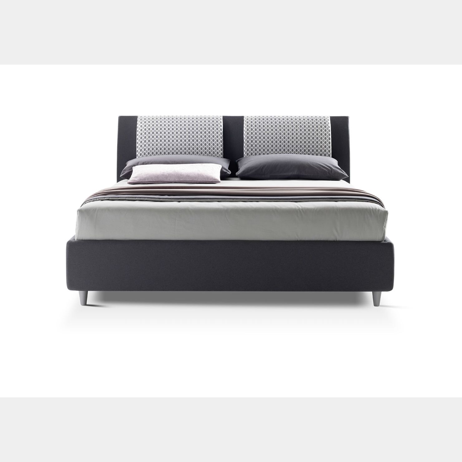 Letto matrimoniale contenitore Hoedus in finitura grigio cenere con cuscini in fantasia.