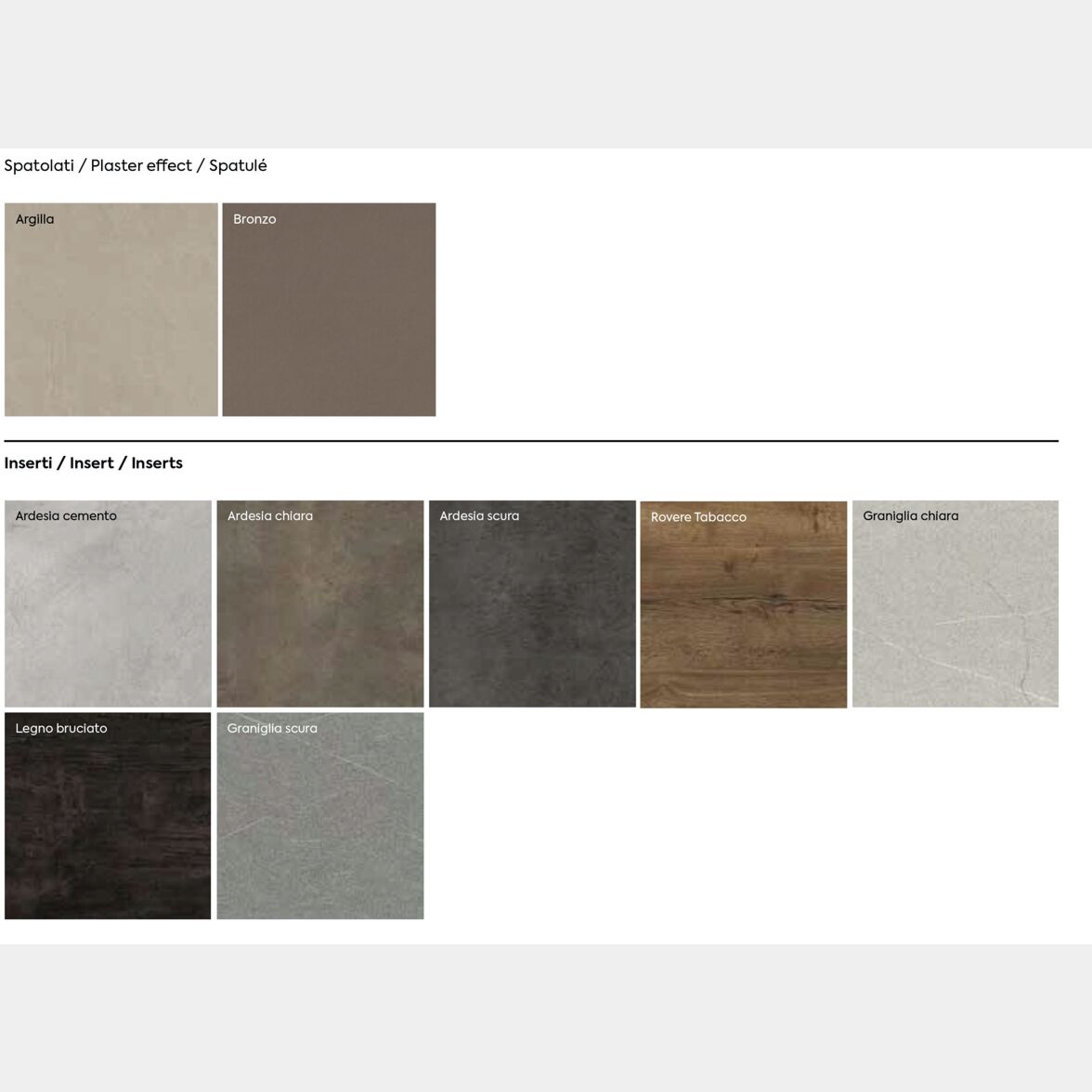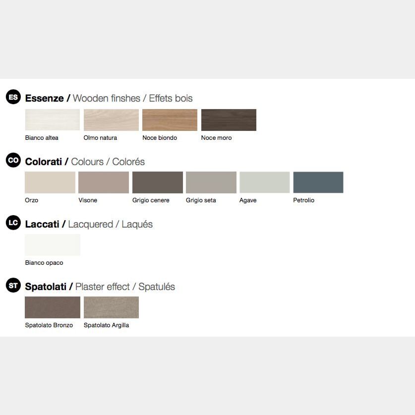 • Finiture: le finiture essenze sono nobilitate e presentano l'effetto venato al tatto, i colorati, spatolati e inserti sono nobilitati, sono disponibili laccati in bianco e orzo opaco. (Struttura letto disponibile solo in essenza).