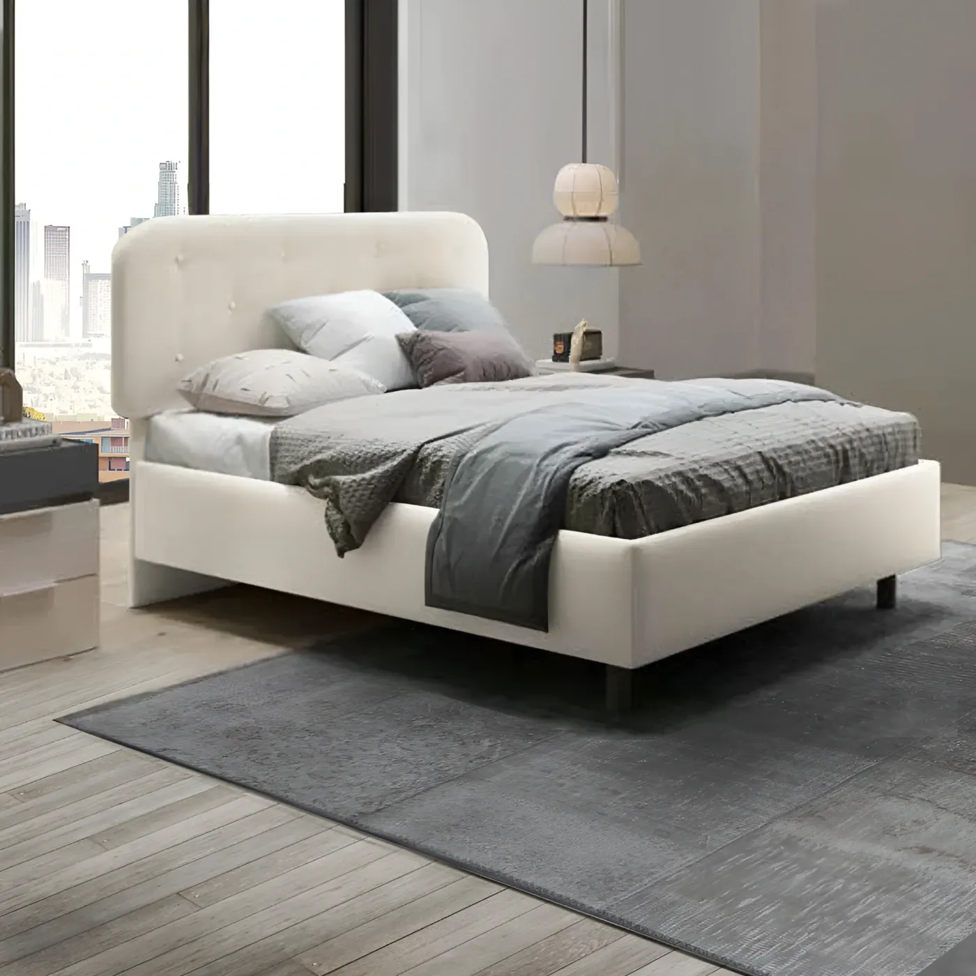 Letto matrimoniale in tessuto colore Bianco in ecopelle. E’ disponibile anche in versione Grigio perla, Fumo, Verde salvia, Ghiaccio, Blu, Tortora.