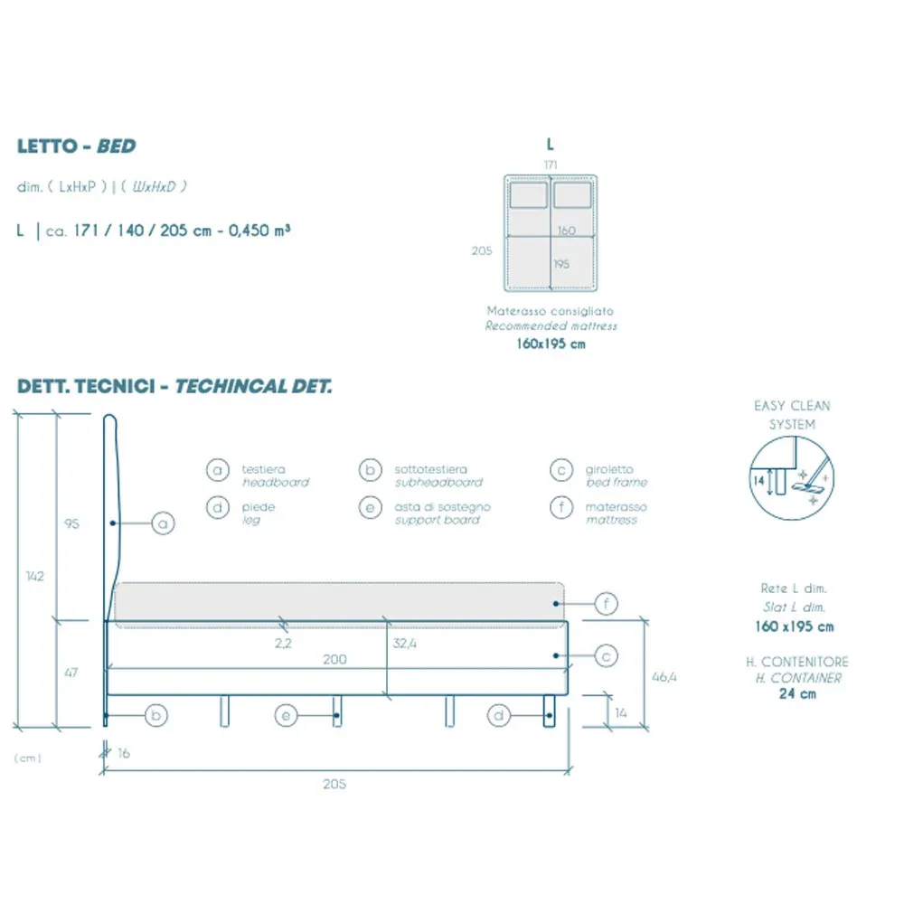Letto matrimoniale con tessuto colore Blu. E' disponibile anche in versione Marrone scuro, Grigio grafite, Grigio perla, Verde, Rosa antico, Marrone sabbia.