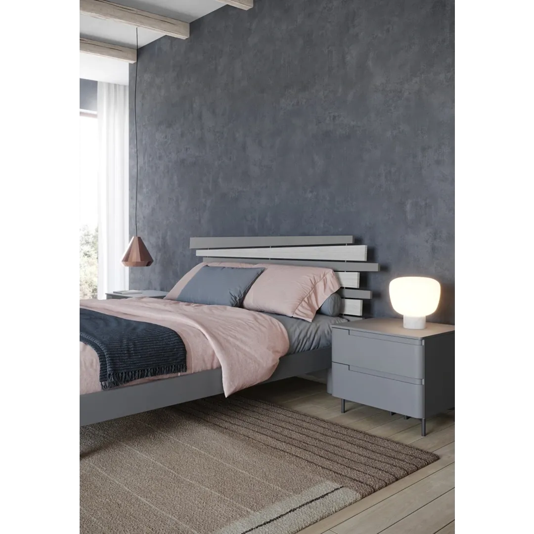 La cosa più cool è sicuramente la testiera: non è la solita testiera dritta, ma è fatta con delle fasce messe un po' sfalsate, come se fossero dei gradini o dei pezzi di un puzzle. Alcune sono color Cenere wood e altre Piombo, e questa cosa gli dà un tocco di movimento e originalità.