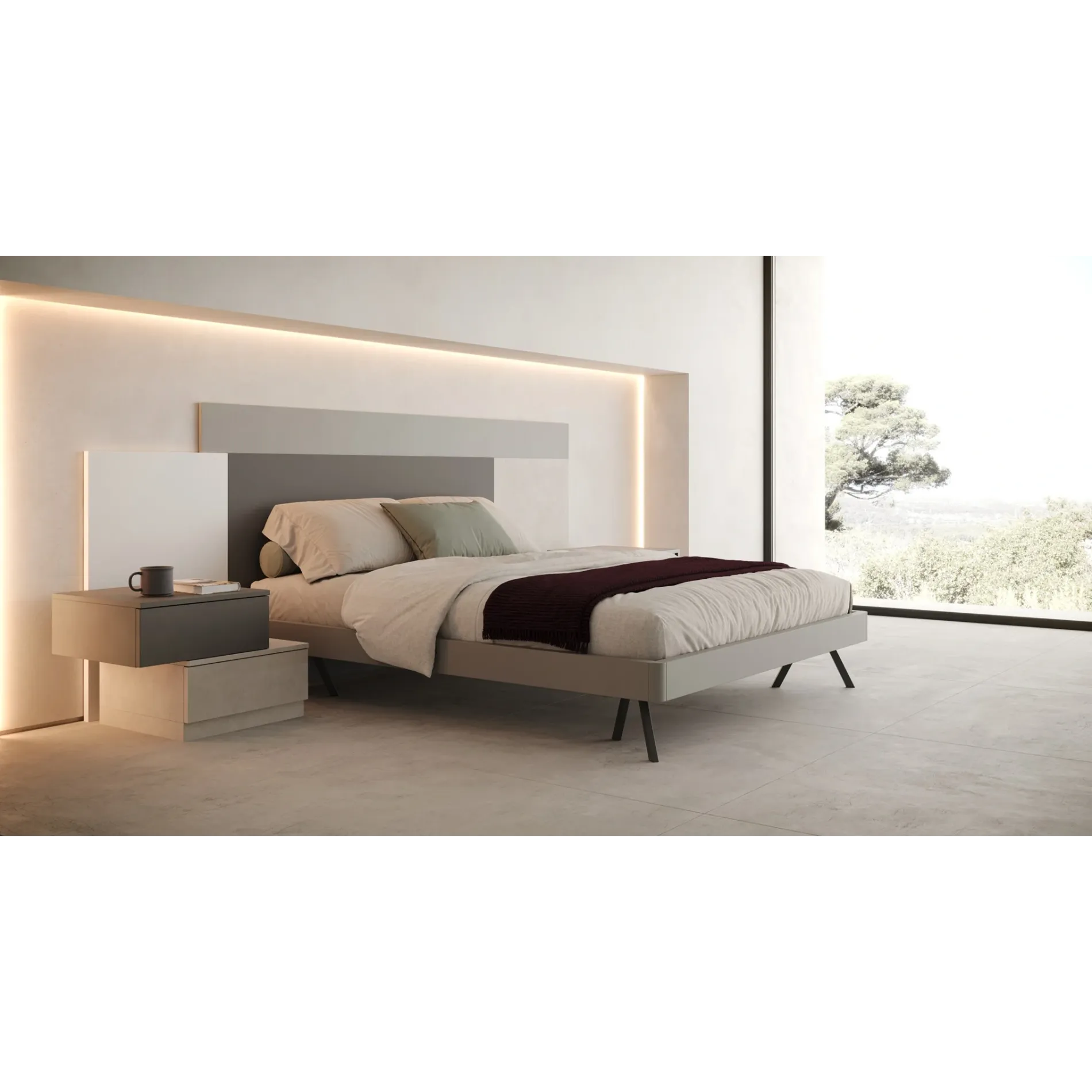 Ma la vera protagonista è la testiera, che è la parte più particolare! Non è una testiera tradizionale, ma sembra quasi un'opera d'arte geometrica. È composta da tre pannelli di diverse altezze e colori, messi vicini: Piombo, Bianco, Alluminio e Calce.