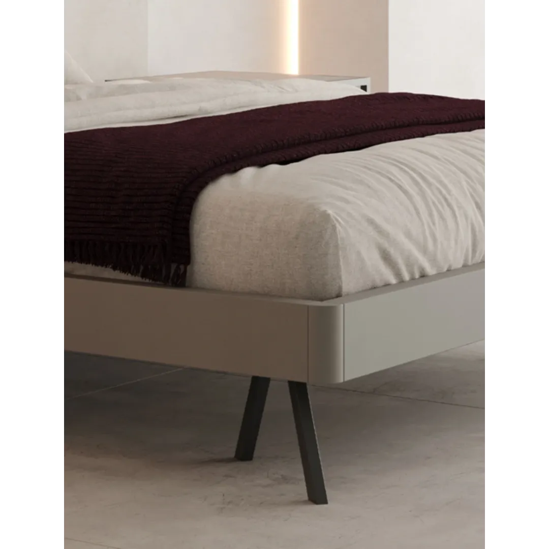Il letto presenta una struttura leggera, quasi come se stesse galleggiando da terra perché poggia su delle gambe sottili e slanciate, di un colore Ardesia che gli dà un tocco di eleganza.