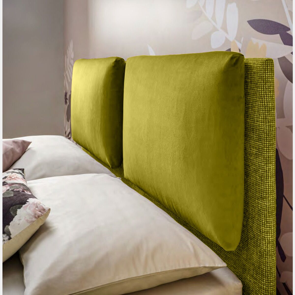 Il rivestimento sfoderabile e lavabile proposto per testata e giroletto è Felce, i due grandi cuscini posti nella testata sono in tessuto Muschio.