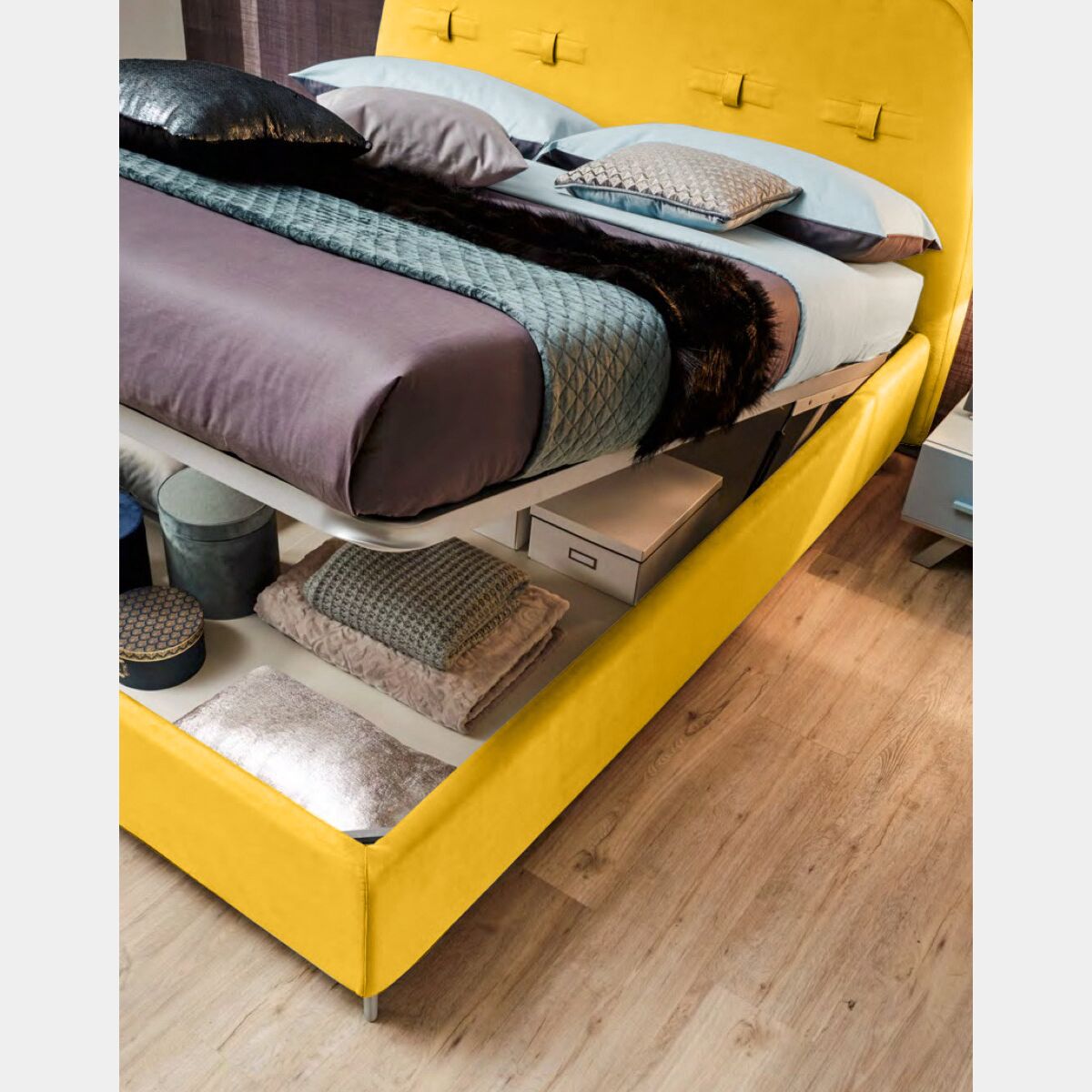 Il letto Marie può essere personalizzato sostituendo tessuto Miele in tinte più accese oppure neutre. Adatto per rete da 180x200.