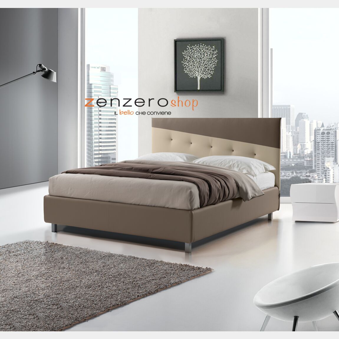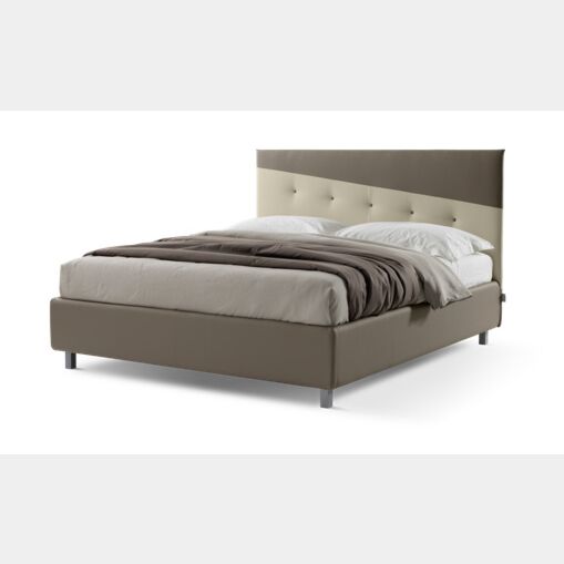 Letto matrimoniale Menkar con contenitore in ecopelle in finitura tortora e beige. E' un letto dal design semplice e funzionale che si integra perfettamente ad ambienti notte da gusto moderno.