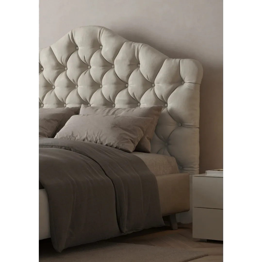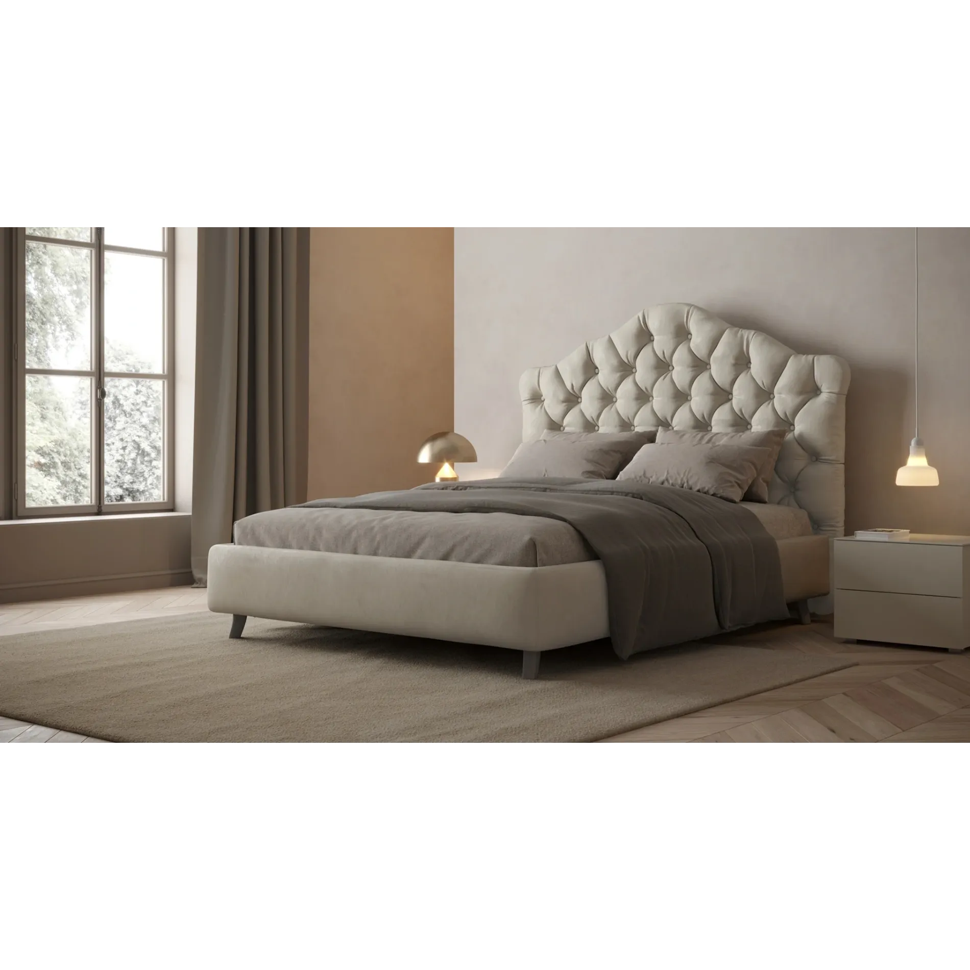Il letto è una vera e propria coccola di stile! La prima cosa che salta all'occhio è la sua testiera che sembra una nuvola imbottita e accogliente. Ha questa lavorazione particolare, create dai bottoni, che la rendono non solo elegante ma anche incredibilmente morbida e invitante.