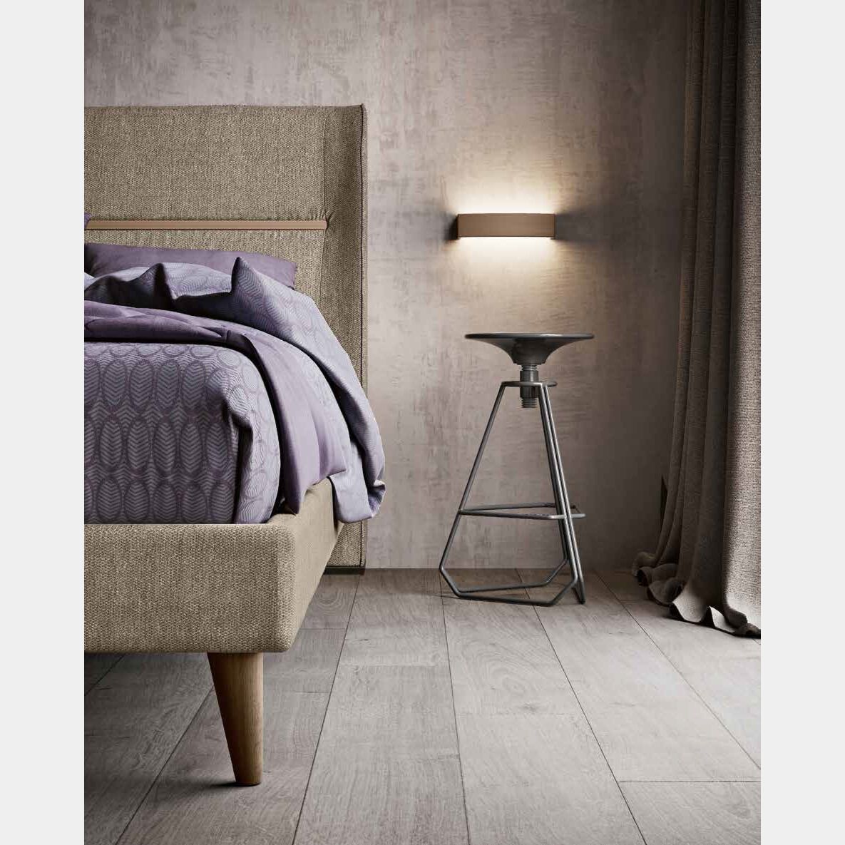 La finitura proposta per il letto mattimoniale è tessuto Castoro ma grazie ad un ampio campionario disponibile è possibile sostituire la finitura con altre tinte, neutri o accese, per adattarle il letto alla propria zona notte. Sono disponibili tre dimensioni: standard con profondità 190, con profondità 200 cm oppure king size. E' possibile richiedere la rete a doghe tramite l'apposito configuratore, vengono fornite le staffe angolare di supporto.