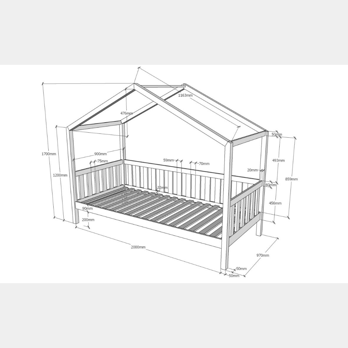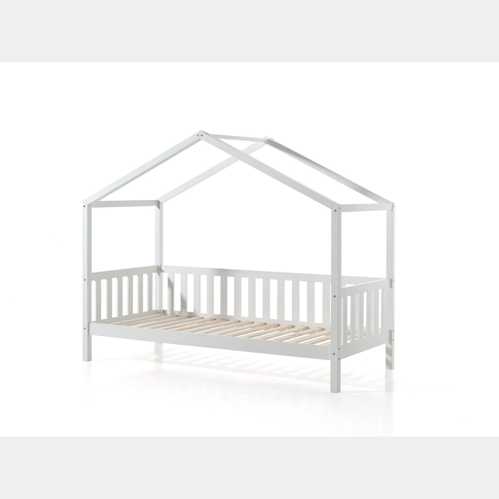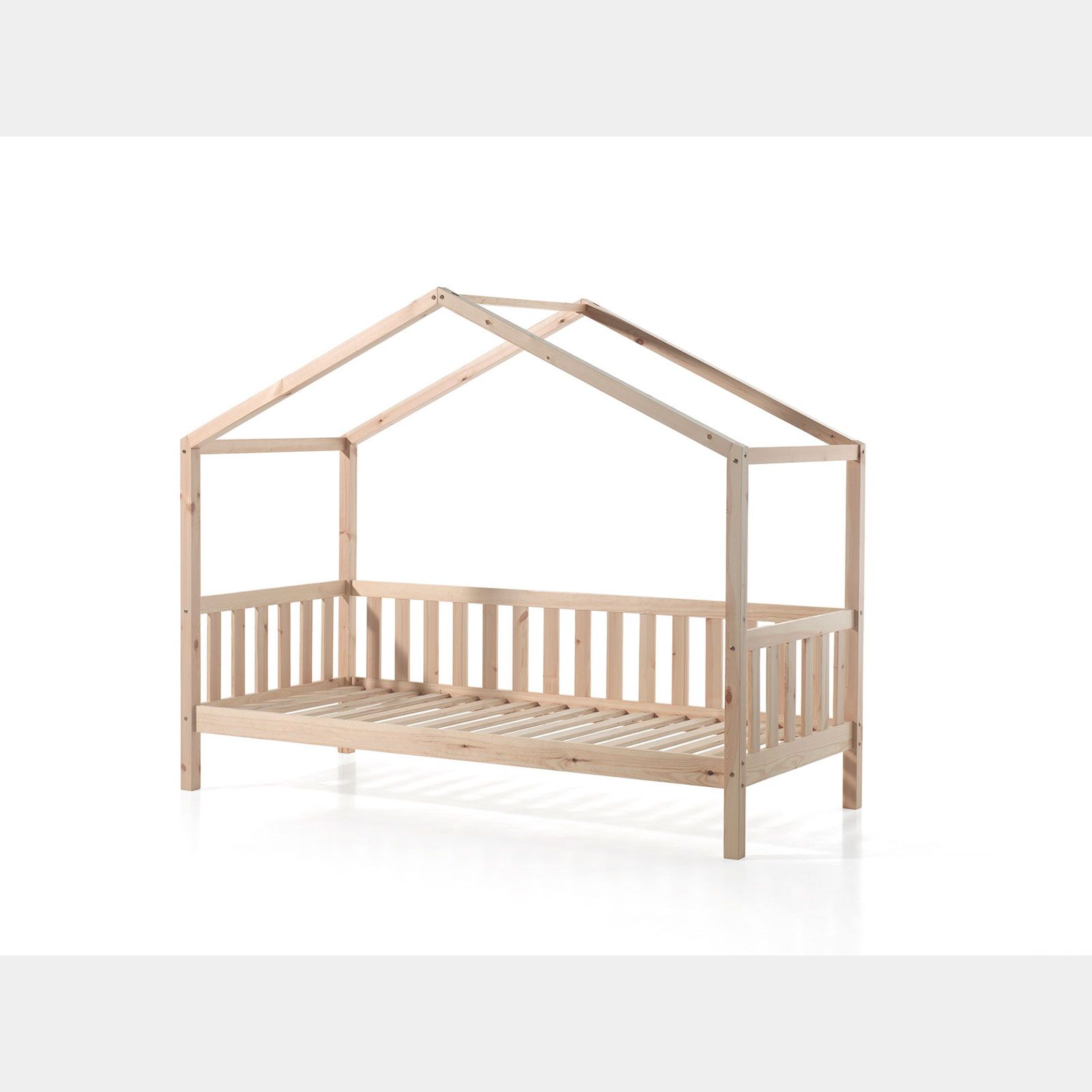 Letto montessoriano con una superficie di 90 x 200 cm. La struttura è composta da una protezione a doghe su tre lati completata da un tetto. Il materiale utilizzato è pino massello, disponibile in finitura naturale, laccato bianco o laccato antracite. Il letto è dotato di rete a doghe.
