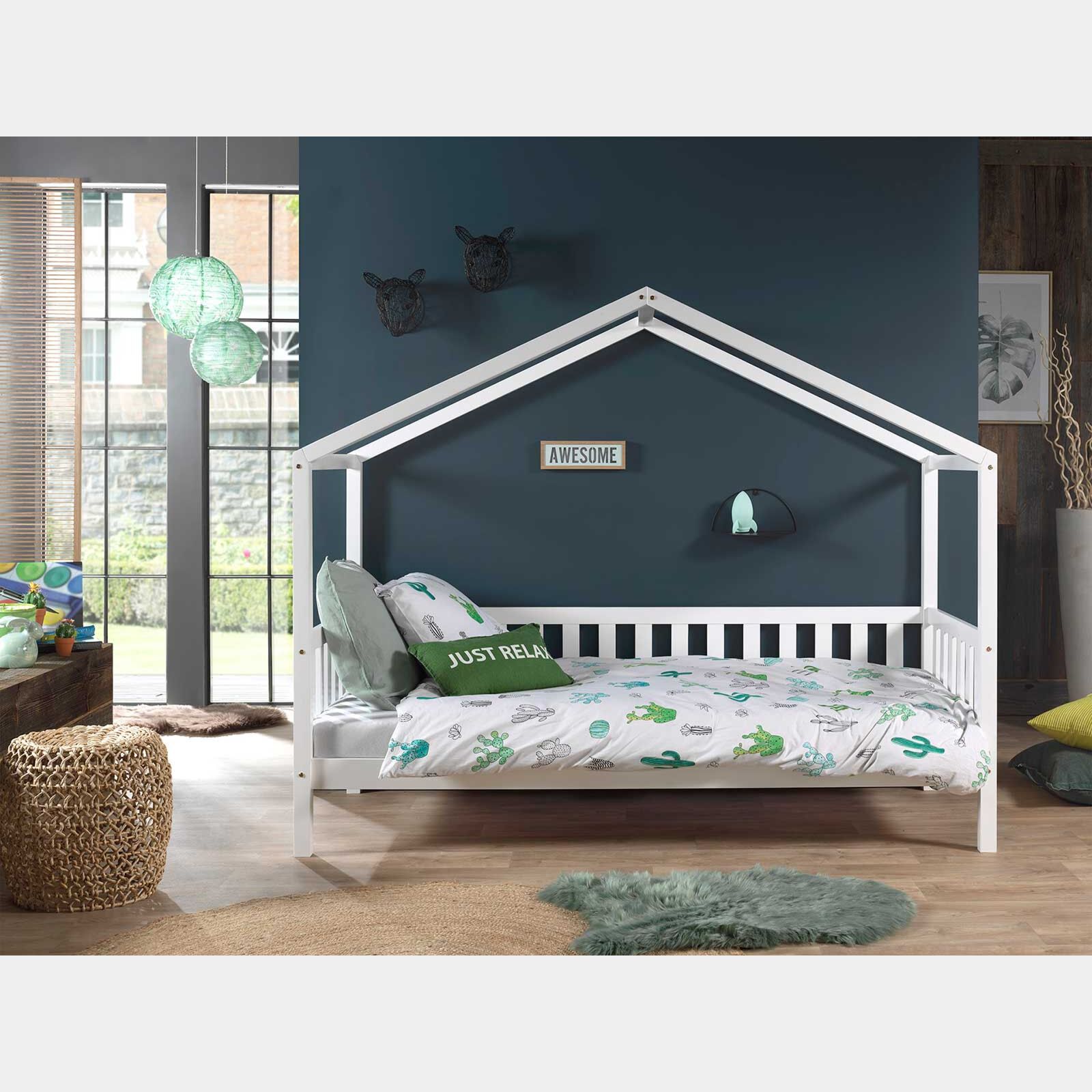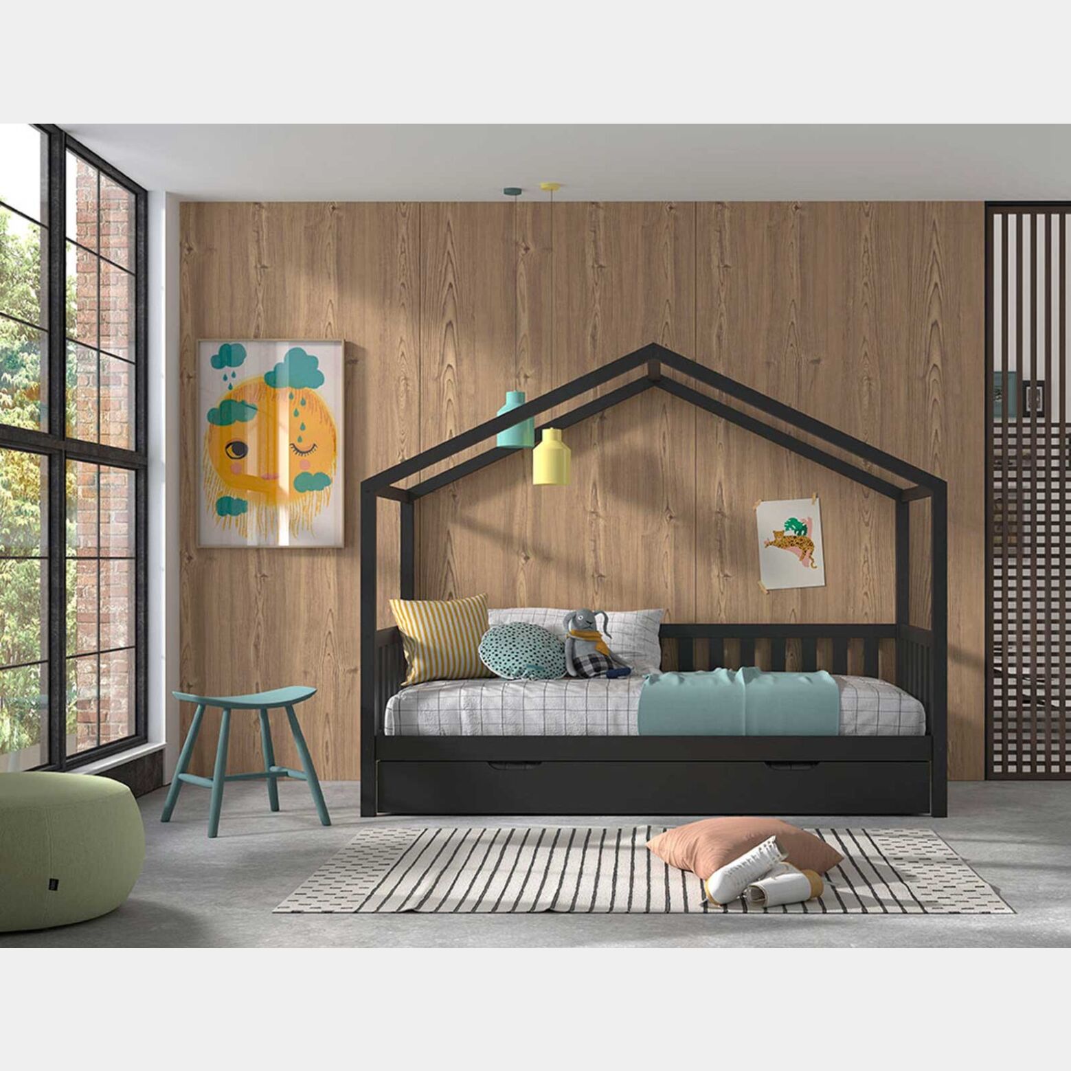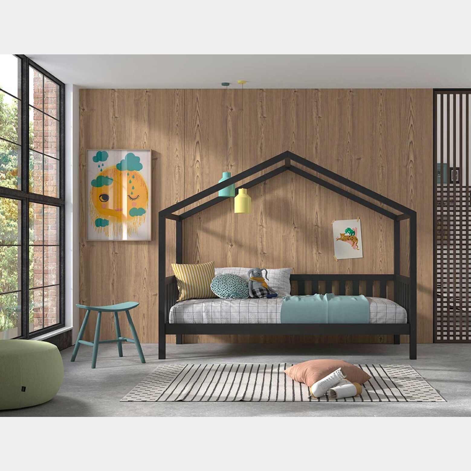 Letto montessoriano con una superficie di 90 x 200 cm. La struttura è composta da una protezione a doghe su tre lati completata da un tetto. Il materiale utilizzato è pino massello, disponibile in finitura naturale, laccato bianco o laccato antracite. Il letto è dotato di rete a doghe.