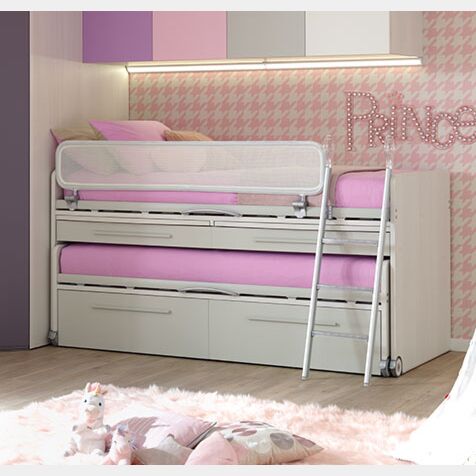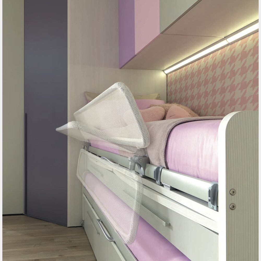 Il letto Space è dotato di due scrivanie indipendenti estraibili che scorrono soltanto in caso di necessità. Il letto superiore è adatto ad un materasso da 80x200, così come il letto inferiore. Il letto è dotato di ruote ad incasso provviste di freno. Le reti a doghe son inculse, scaletta e parabordo invece sono optional. A completare il letto sono 2 cassettoni inferiori e 2 cassetti centrali per garantire un spazio di appoggio per piccoli oggetti utilizzati durante lo studio.