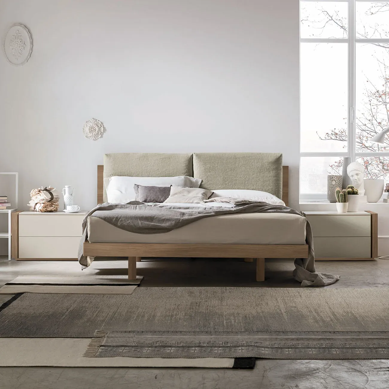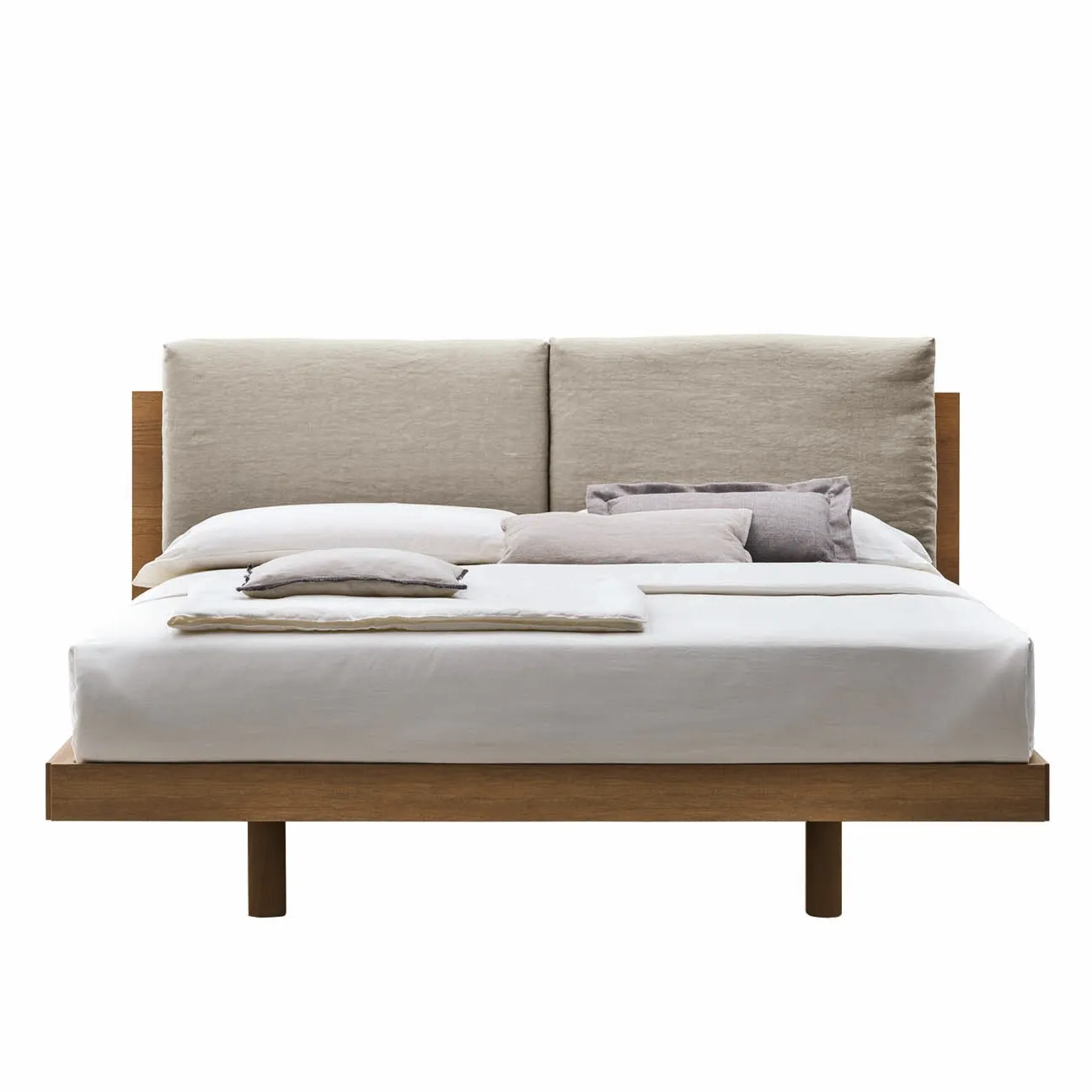 Il rivestimento in lino contrasta la calda finitura materica Noce ambra, evidenziano la morbida linea del letto. L'ampia gamma di finiture disponibili consente una totale personalizzazione del letto, assicurando ad ognuno il perfetto complemento d'arredo per la propria zona notte.