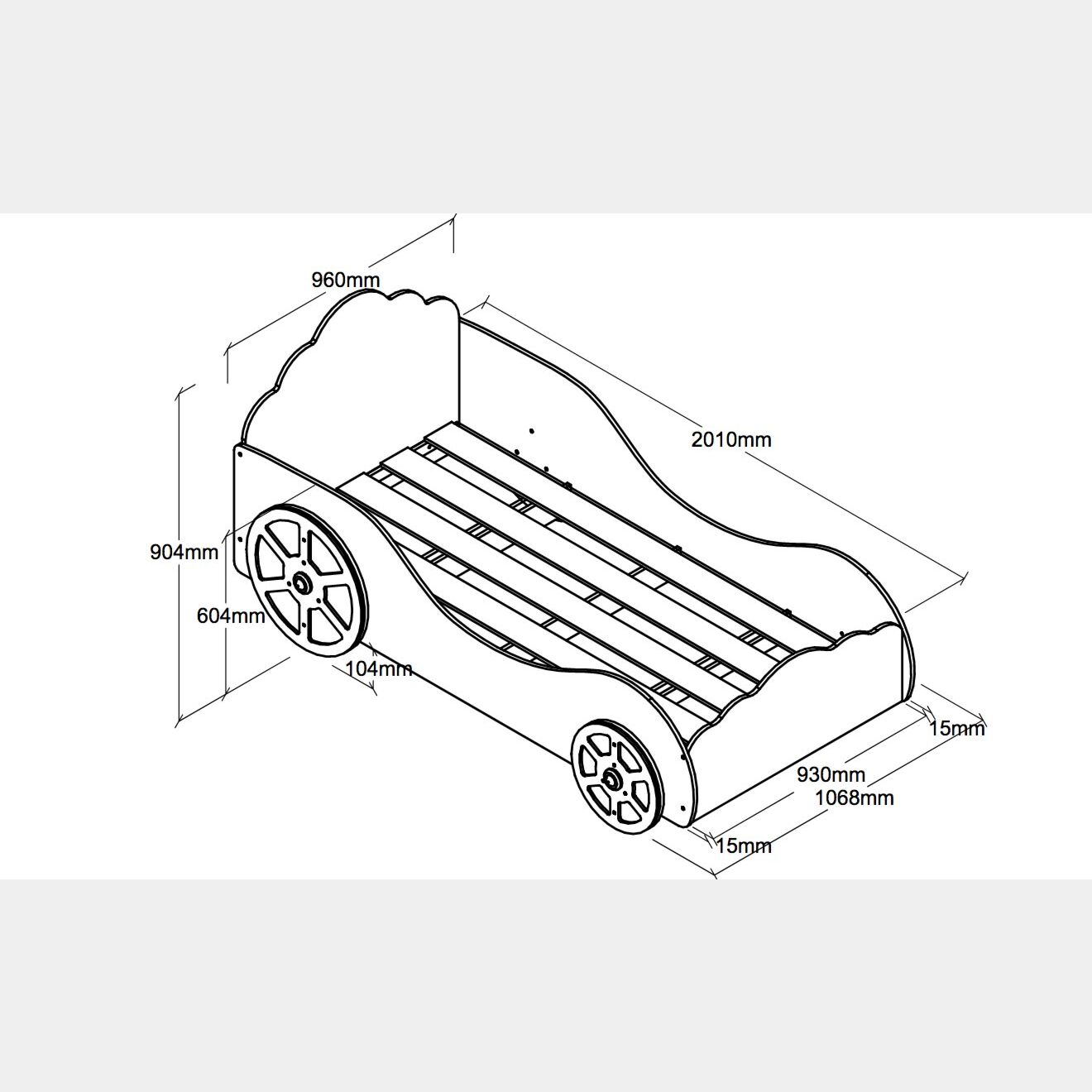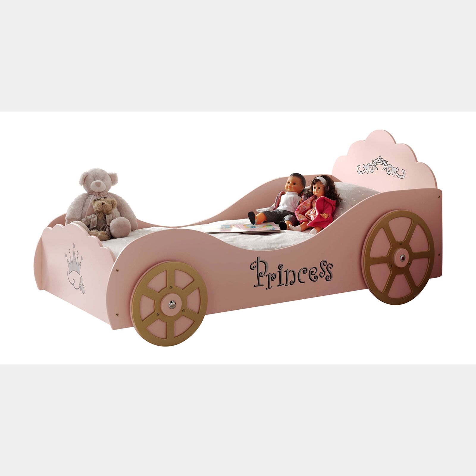 Il letto per bambine è una macchina in rosa laccato con numerosi dettagli per valorizzare al meglio il design. Testata e pediera hanno una forma ondulata che ricorda le nuvole, nel laterale è presente la scritta "Princess" e nella pediera un disegno della corona. Le ruote sono messe in evidenza grazie alla finitura oro.