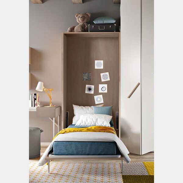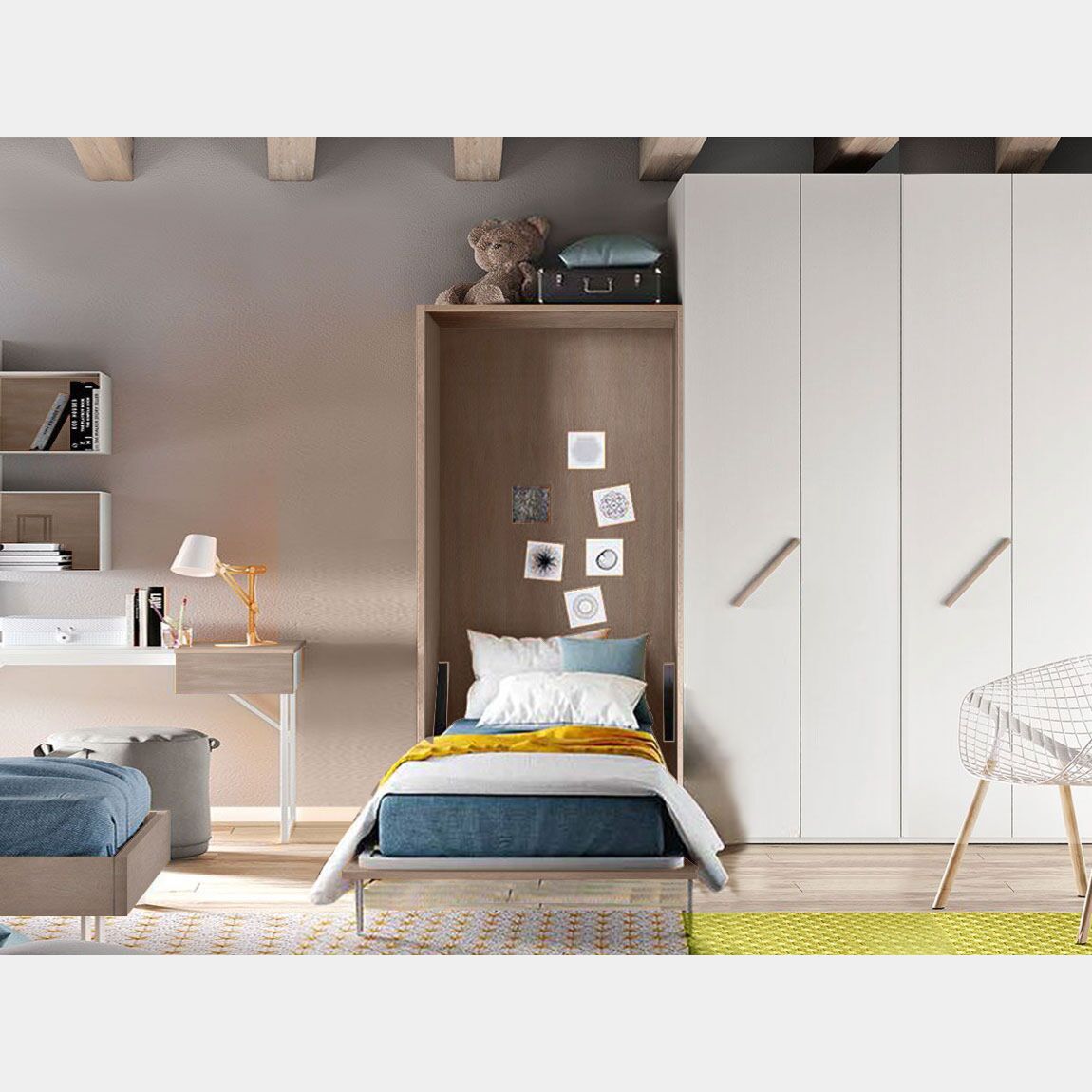 Per ospitare gli amichetti possiamo scegliere un letto salvaspazio: una soluzione pratica e colorata. Grazie alla sua struttura fornisce un posto letto utilizzabile anche negli spazi più ristretti. Il letto viene proposto nella finitura Gessato Canapa, è possibile però personalizzarlo scegliendo tra un'ampia gamma di colori.
