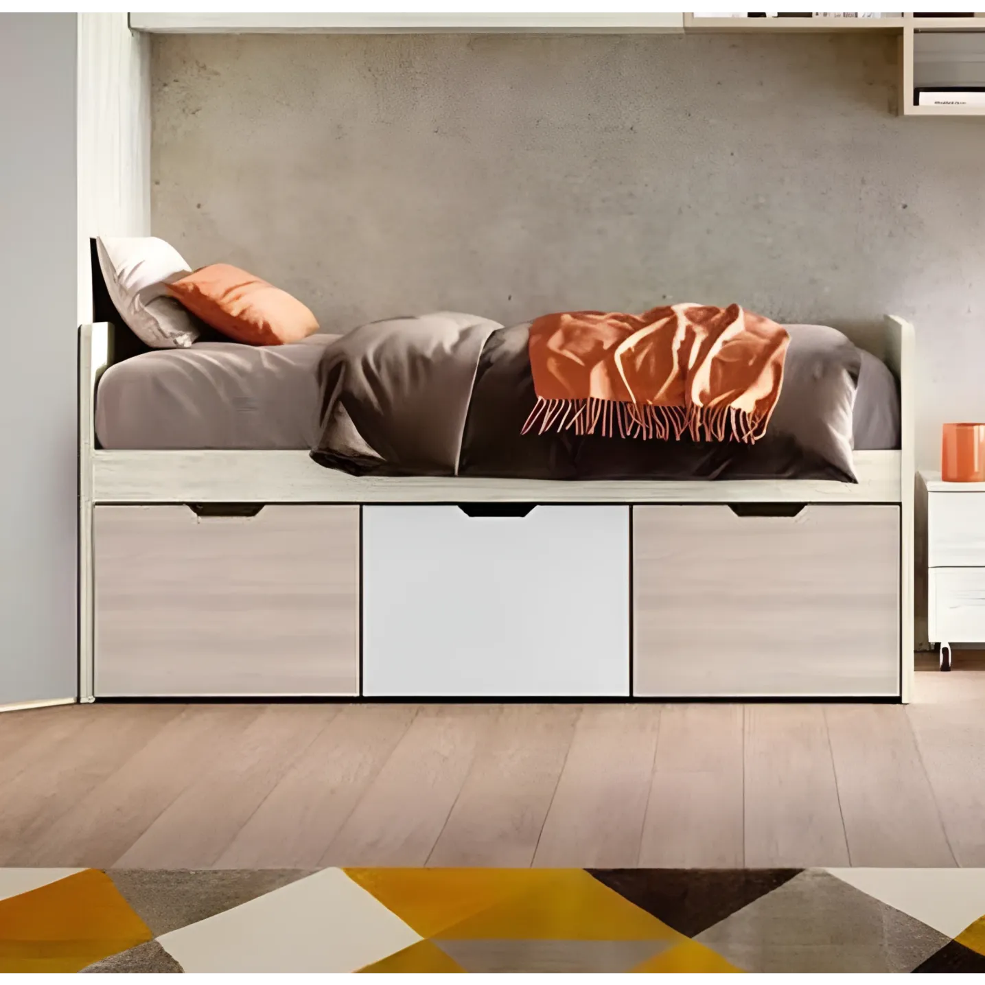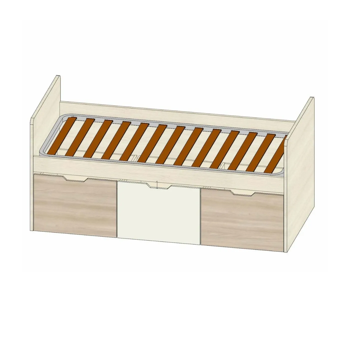 Letto singolo 3 cassetti, finitura Bianco altea, Bianco e Olmo natura, collezione Pop