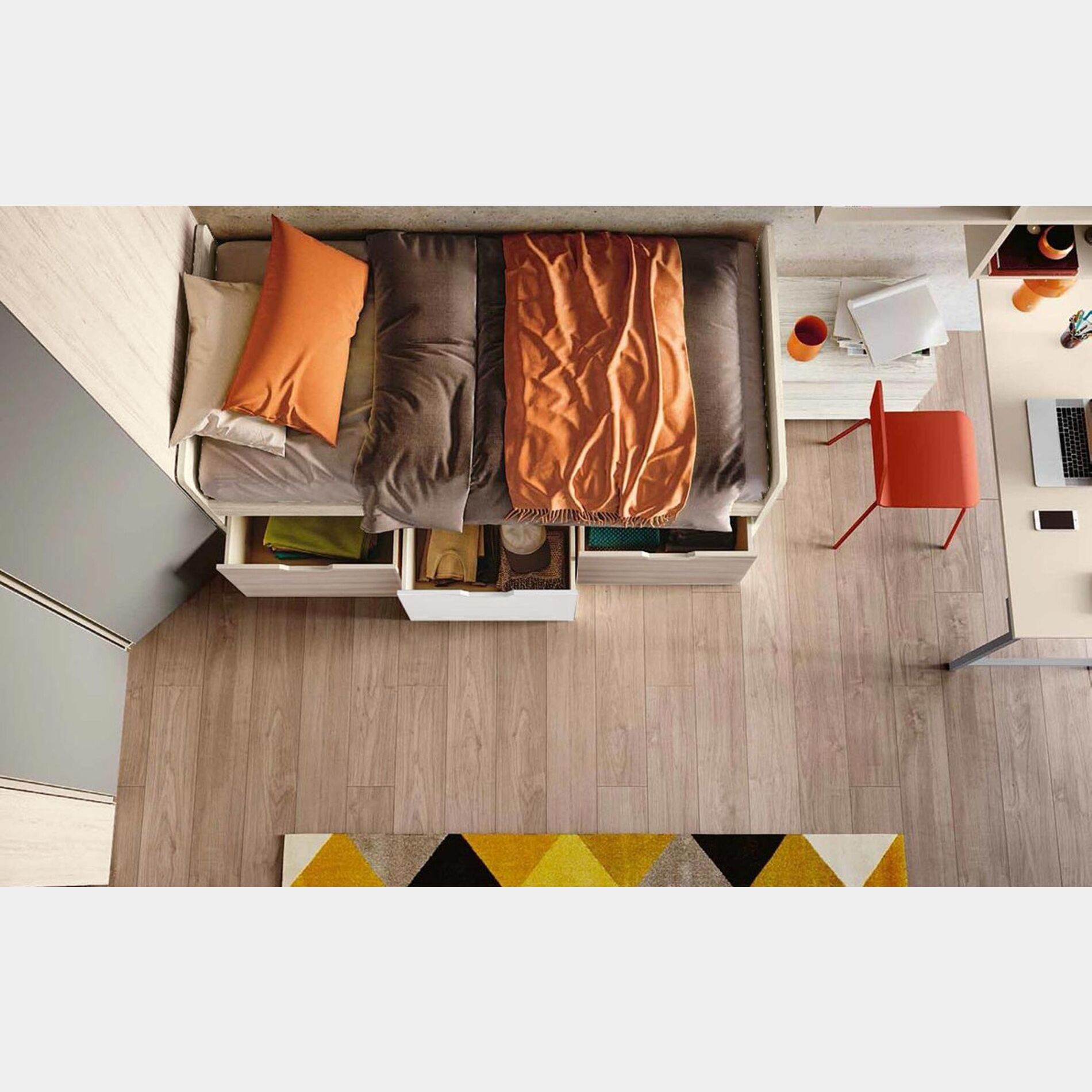 Le finiture Bianco altea, Bianco opaco e Olmo natura caratterizzano il letto, assicurando alla cameretta calore e accoglienza. Progettato per camerette dalle dimensioni contenute il divano letto offre praticità e comodità, limitando l'ingombro nell'ambiente.