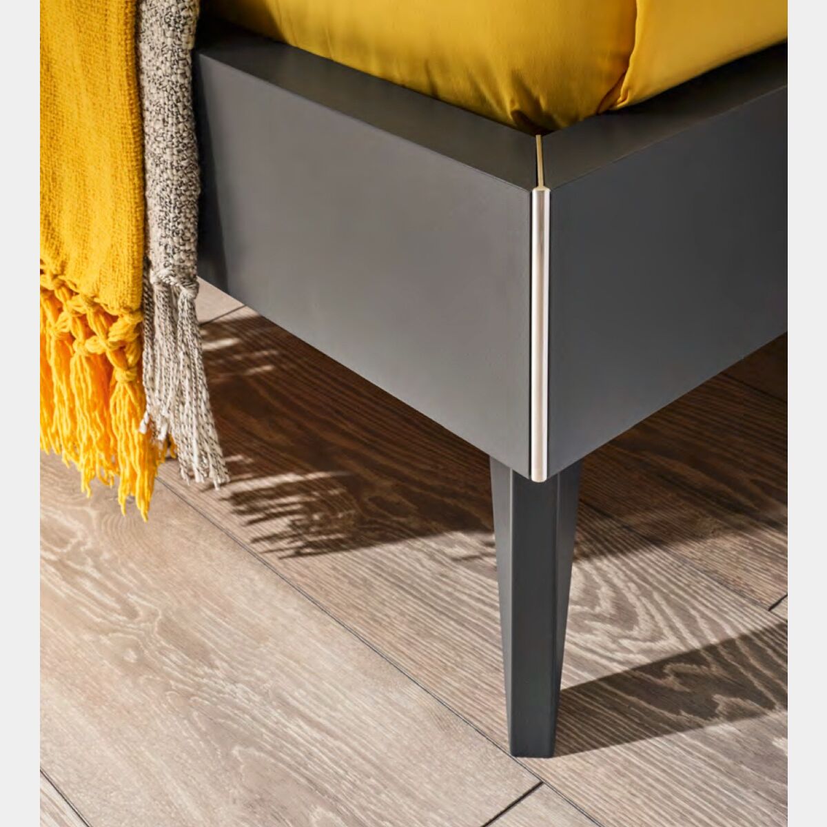 Il letto presenta un giroletto in finitura Grafite, la testata Nocciola e 4 colori differenti in tessuto non sfoderabile: Cotone, Papaya, Ebano ed Argilla.