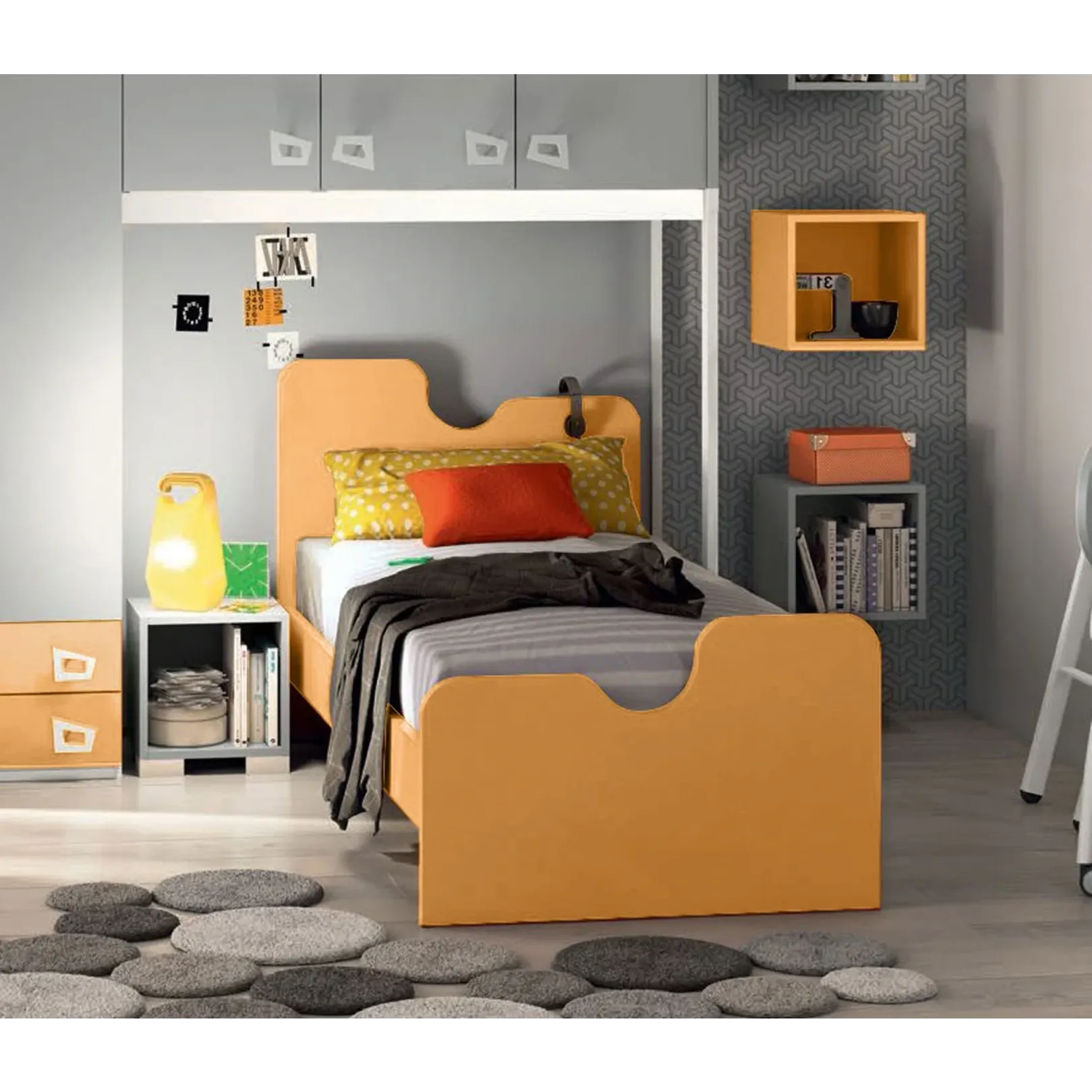 Letto singolo di design in finitura Giallo Zafferano. Questo letto si differenzia dagli altri grazie alla particolare forma di tastiera e pediera. Può essere personalizzato cambiando la finitura, infatti si può richiedere di tutti i colori presenti nella tabella.