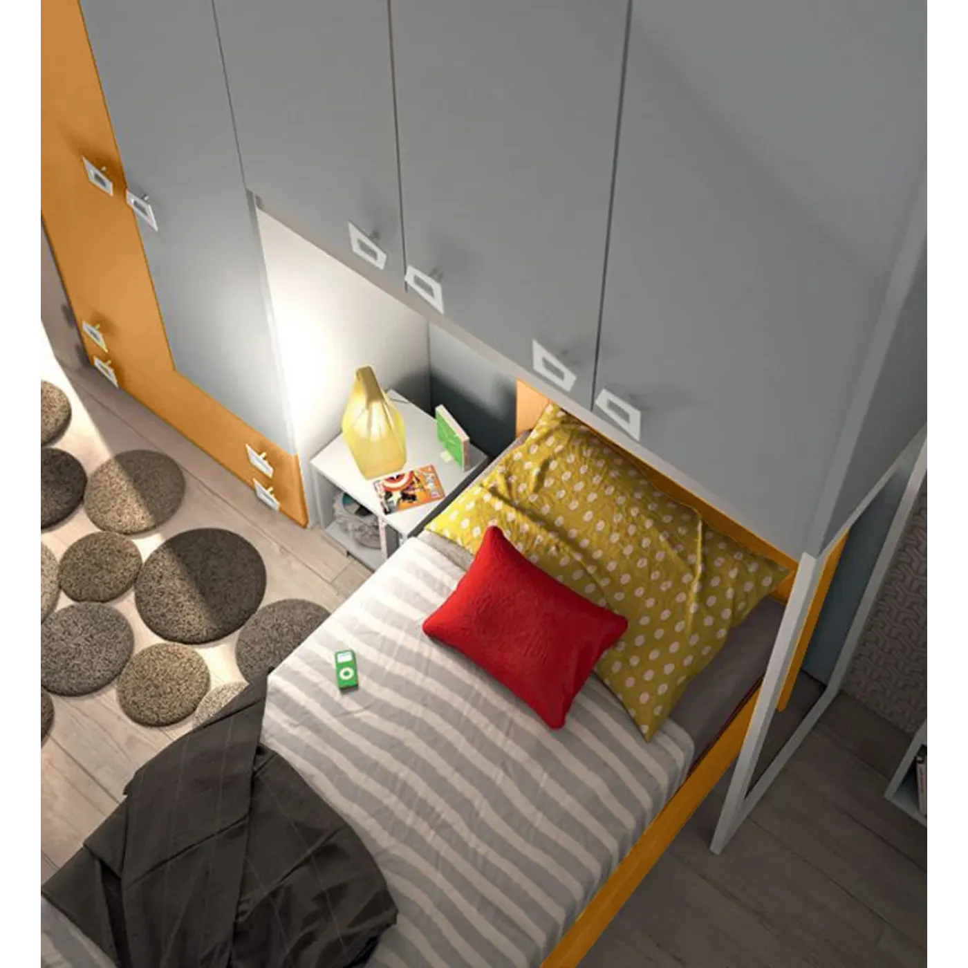 A questo letto singolo è possibile aggiungere una rete a doghe con staffe, il materasso e il comodino.